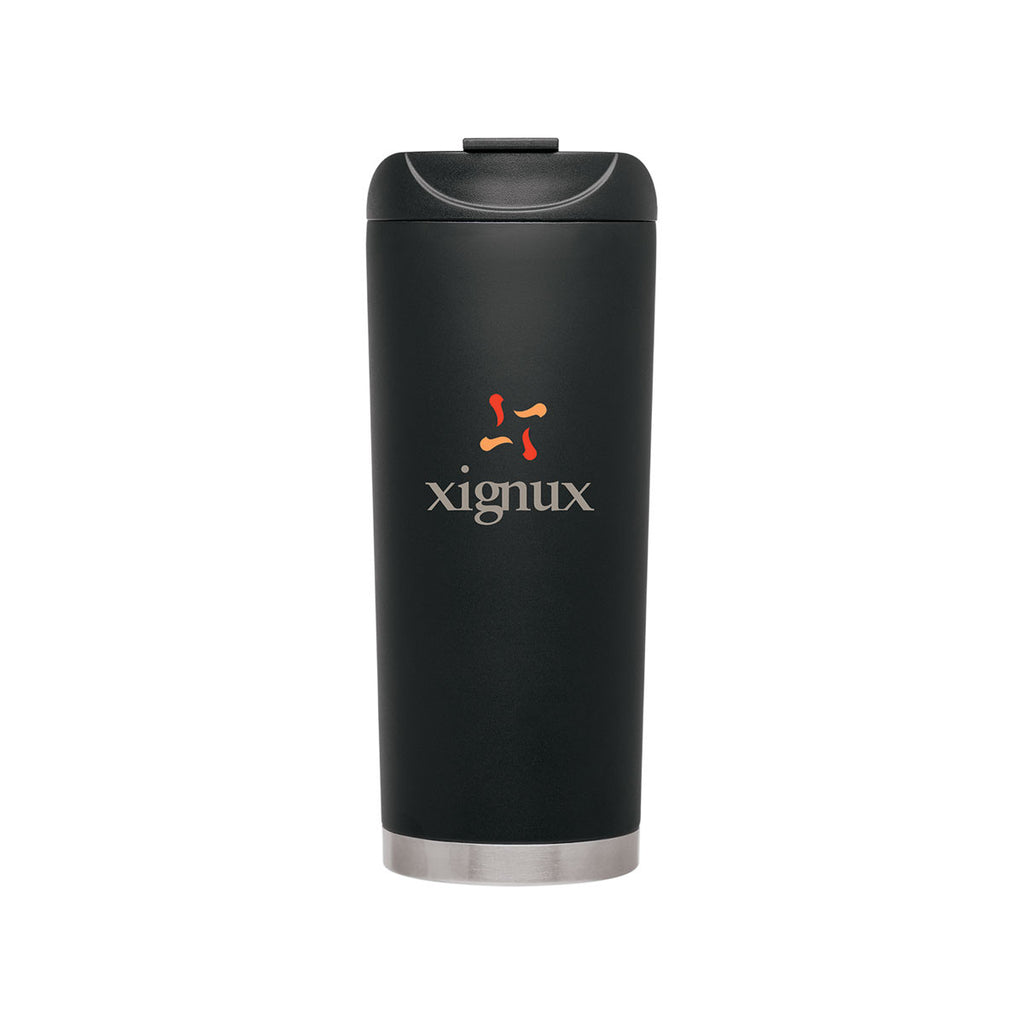 A lightweight, double-walled, vacuum-sealed ETS Matte Black Cayman Stainless Steel Tumbler 16 oz designed to keep drinks hot or cold for a full 24-hours. Equipped with easy to operate threaded snap-fit lid. This traveler's mug can be customized with any logo, image, or name for corporate gifting sets. It boasts an 18/8 grade construction and 16 oz capacity.