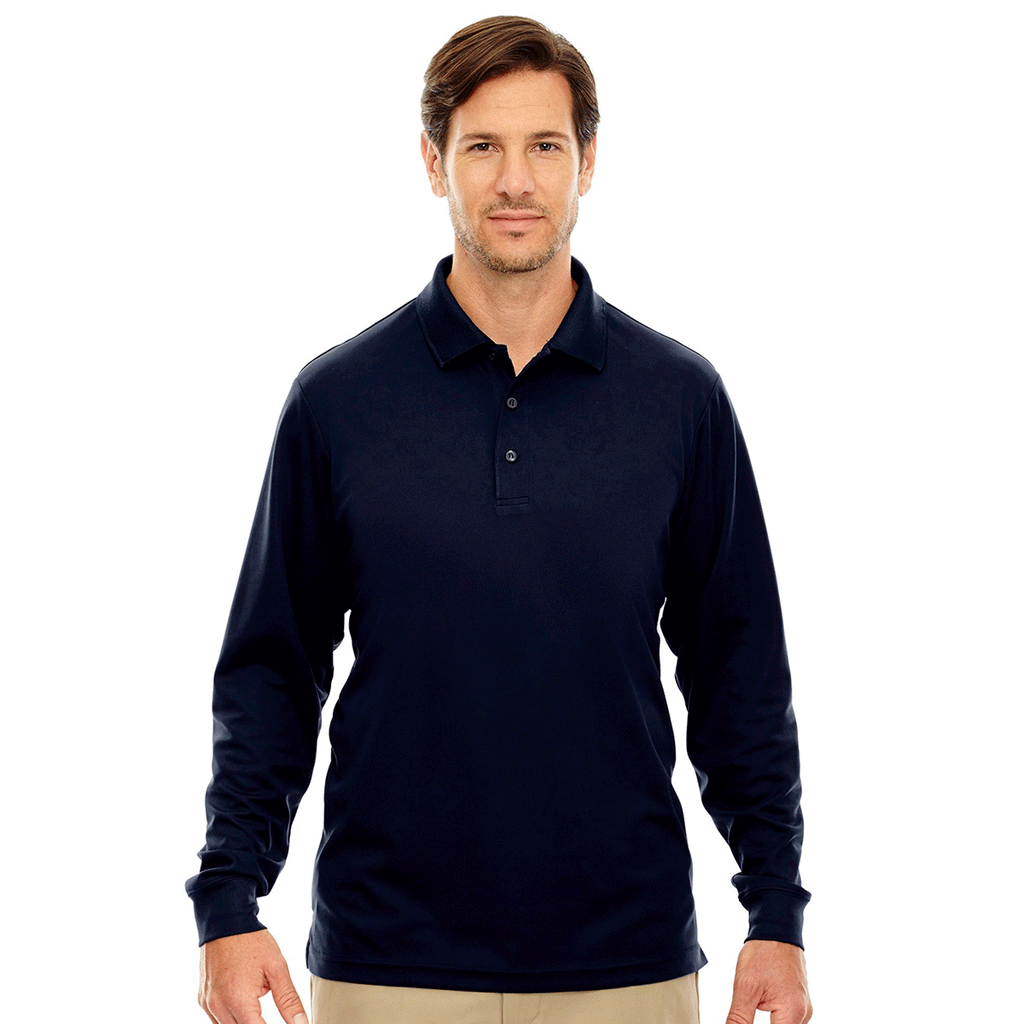 Give the Core 365 Men's Classic Navy Tall Pinnacle Performance Long-Sleeve Pique Polo as the ultimate corporate gift to your loyal customers and dedicated employees. The versatile long sleeve polo makes a professional fashion statement in the workplace and a sleek fashion statement during a night on the town. Moisture wicking technology quickly removes the perspiration that builds up because of you dancing the night away. Rugged 100% polyester never rips and tears to give you a go to shirt for all occasions. The matching flat knit collar adds a unique style element to a polo that exudes panache.Highlights