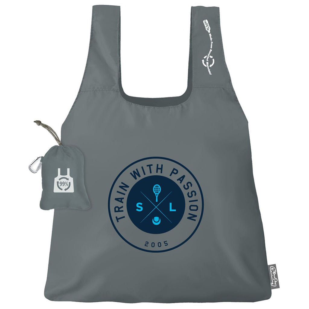 The ChicoBag Grey Original rePETe Totere replaces 1040 Single-Use Bags throughout its life. This reusable tote bag features a 25-pound carrying capacity. It conveniently stores itself inside the built-in pouch and easily clips onto keys with the built-in carabiner. All ChicoBag rePETe products contain GRS Certified fabric which is made from 100% post-consumer recycled plastic bottles. Made with recycled material for sustainability. Reach out out about customiziing with a company logo.