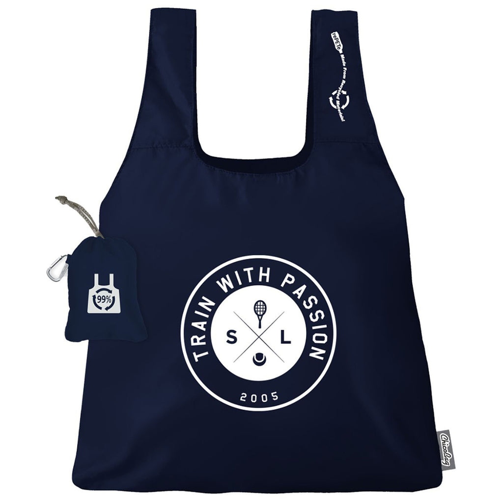 The ChicoBag Navy Original rePETe Totere replaces 1040 Single-Use Bags throughout its life. This reusable tote bag features a 25-pound carrying capacity. It conveniently stores itself inside the built-in pouch and easily clips onto keys with the built-in carabiner. All ChicoBag rePETe products contain GRS Certified fabric which is made from 100% post-consumer recycled plastic bottles. Made with recycled material for sustainability. Reach out out about customiziing with a company logo.
