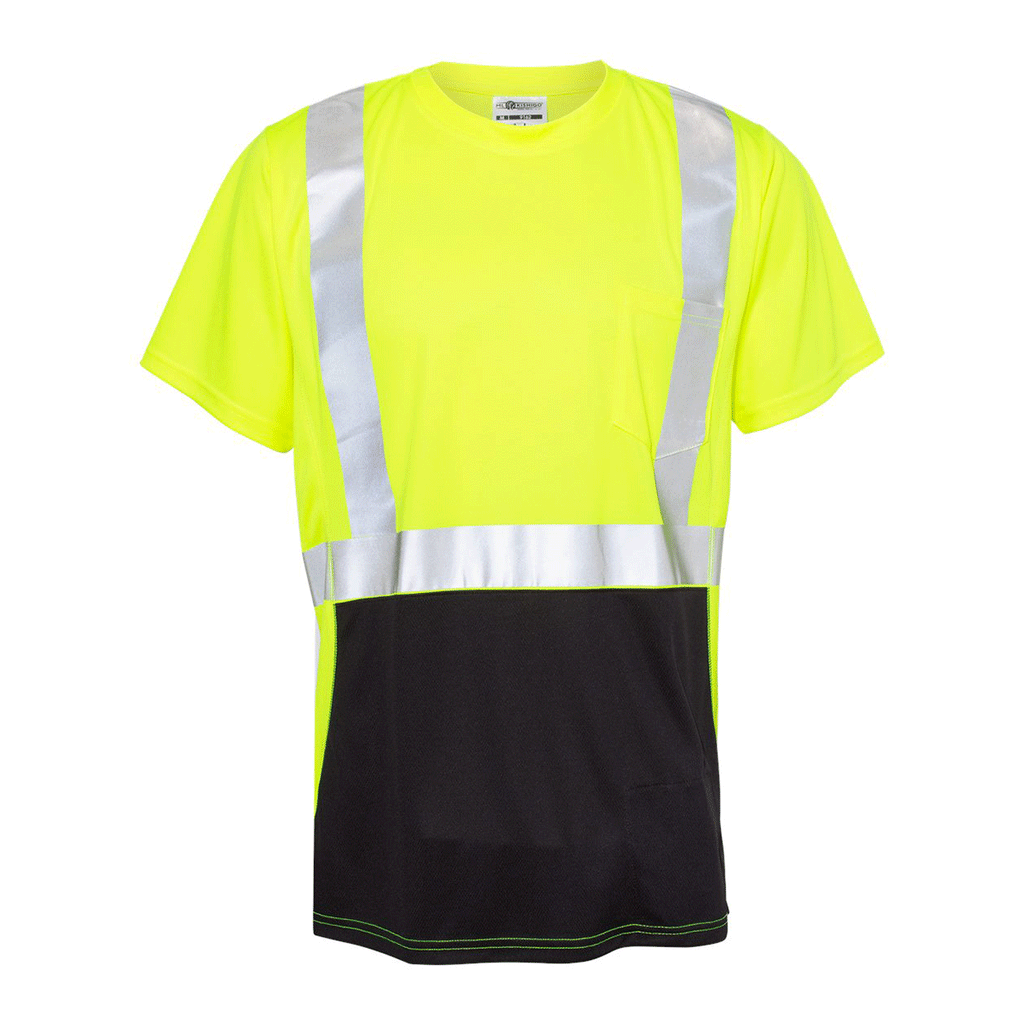 Add fun to your custom ML Kishigo Men's Lime Class 2 Black Bottom T-Shirt with a company logo to use as workwear that workers will enjoy wearing. Made of a breathable microfiber polyester material that wicks away moisture, this is a must have for those that work outdoors, especially when they need to be noticed. Add a custom logo to create a line of industrial apparel in this updated tee with a black front bottom that starts just below the reflective tape stripe. This presents a more professional, clean appearance for all workers.Highlights