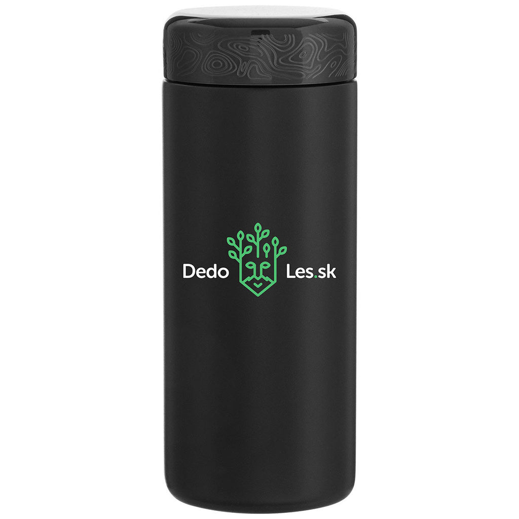 A custom H2Go Matte Black Aerial 16.9oz Recycled Stainless Steel Tumbler, reflecting a commitment to sustainability. Its double-wall insulation keeps drinks at the desired temperature, and the sleek design fits comfortably in hand. Custom branding opportunities make it a thoughtful and eco-friendly corporate gift.