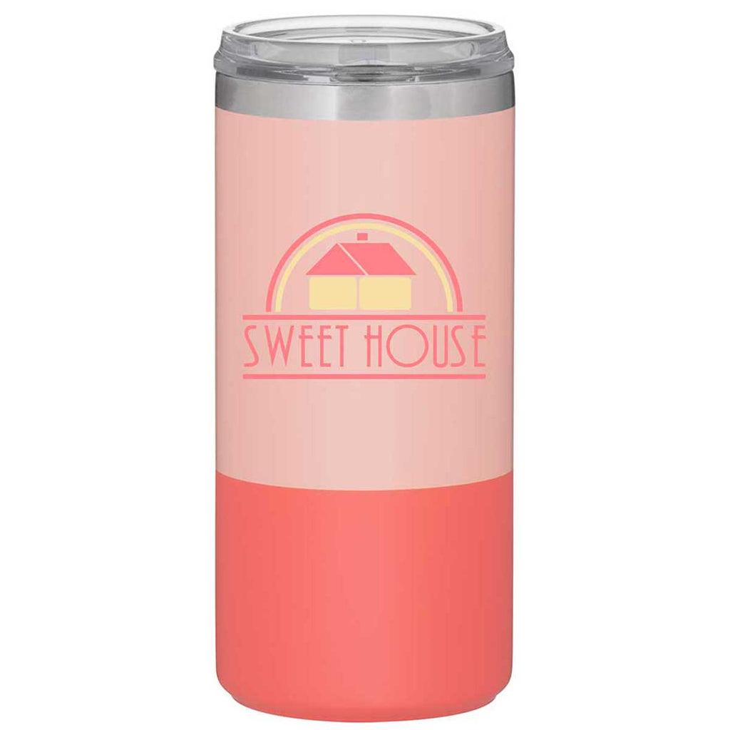 Match your custom logo with the ETS Peach 16 oz Gala Stainless Steel Thermal Tumbler's dual-tone color to create a pop advertisement of your brand - adding your company logo or name on the drinkware also gives you a customized item that you can use as an event giveaway or customer giveaway. The Gala features copper insulation and a double wall body that keeps your drinks hot or cold for hours without the usual sweating!The minimum order for this product is 48 pieces.