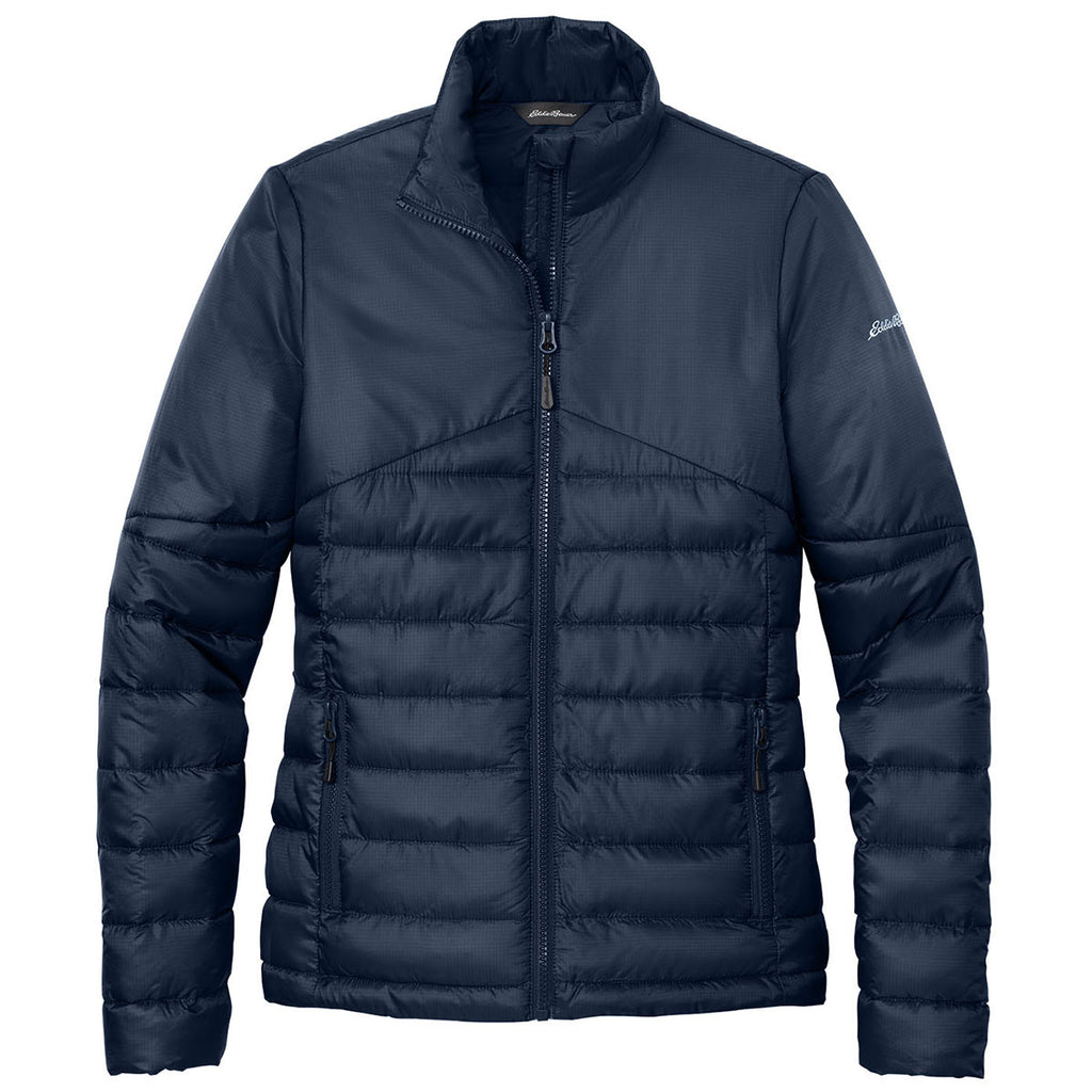 Add embroidery to the Eddie Bauer Women's River Blue Navy Quilted Jacket for a great cooler weather look that will turn heads. This jacket comes together with minimal bulk yet maximized performance for all your adventures. A perfect choice for snowboarding, skiing, or other outdoor fun. Place an order today.