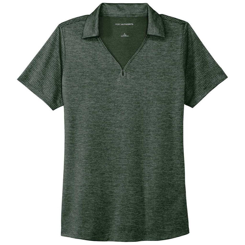 Stand out in a custom embroidered Port Authority Women's Deep Forest Green Shadow Stripe Polo. This uniquely styled polo makes a statement with a stripe design that enhances custom logos that are carefully embroidered on in just the right spot. The self-fabric collar with a keyhole adds to the modernity of the polo that can go from the golf course to brunch with friends. Add a company logo to use these as employee apparel that will stand up to a long day at work. Wear tucked in or out with the slightly rounded hem and enjoy the moisture wicking fabric even when the day is far too long.Corresponding Men's Style: Port Authority Men's Deep Forest Green Shadow Stripe Polo