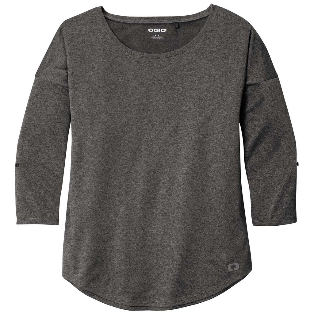 Add screen print to the OGIO Women's Dark Heather Grey Gravitate Scoop 3/4-Sleeve to create a look that will look great no matter where you happen to be at the time. This flattering look has a beautiful drape that looks good on a variety of people. Made of a 100% poly fabric with stay cool wicking technology. The curved hem and Dolman shoulders paired with an open neck create a look that can serve as employee apparel with a company logo or a welcomed transition piece in your logoed apparel options. Great to wear alone or pair with a jacket, this simple 3/4 sleeve top is a must have.