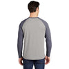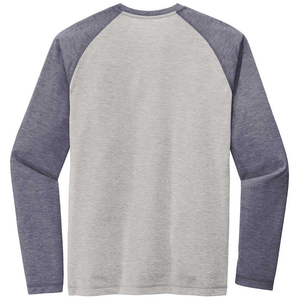 Corresponding Women's Style:Sport-Tek Women's True Navy Heather/Light Grey Heather PosiCharge Long Sleeve Tri-Blend Wicking Scoop Neck Raglan Tee