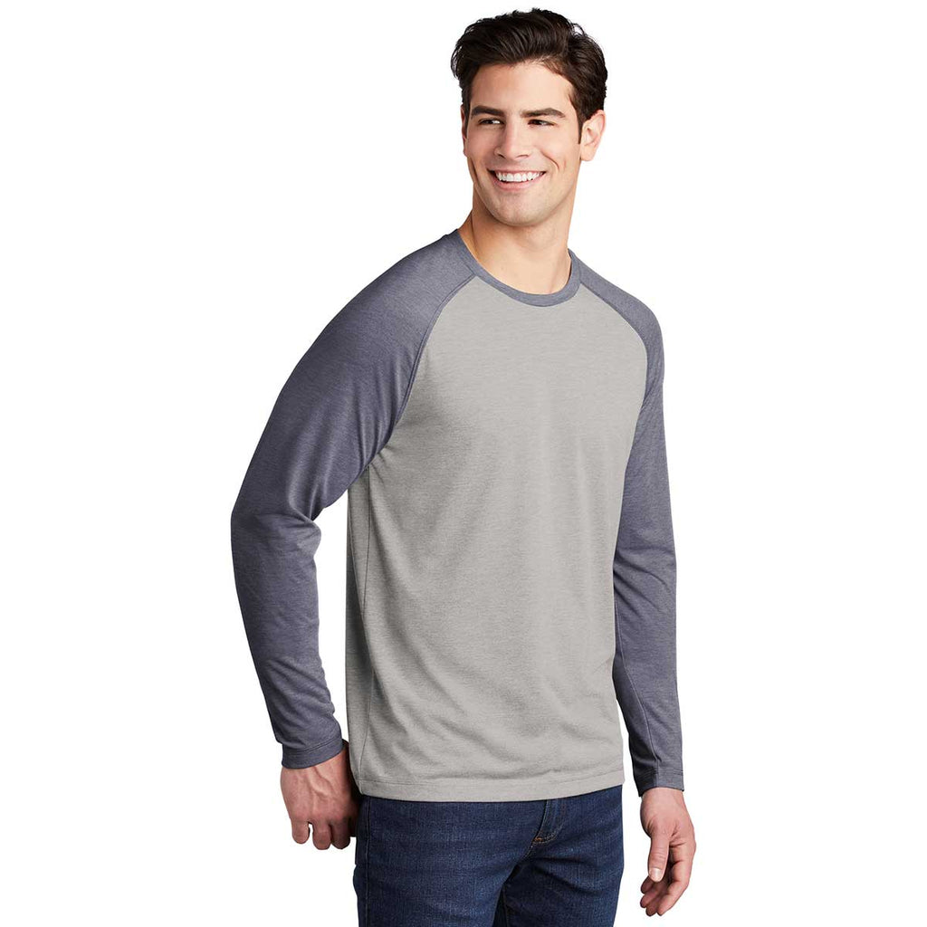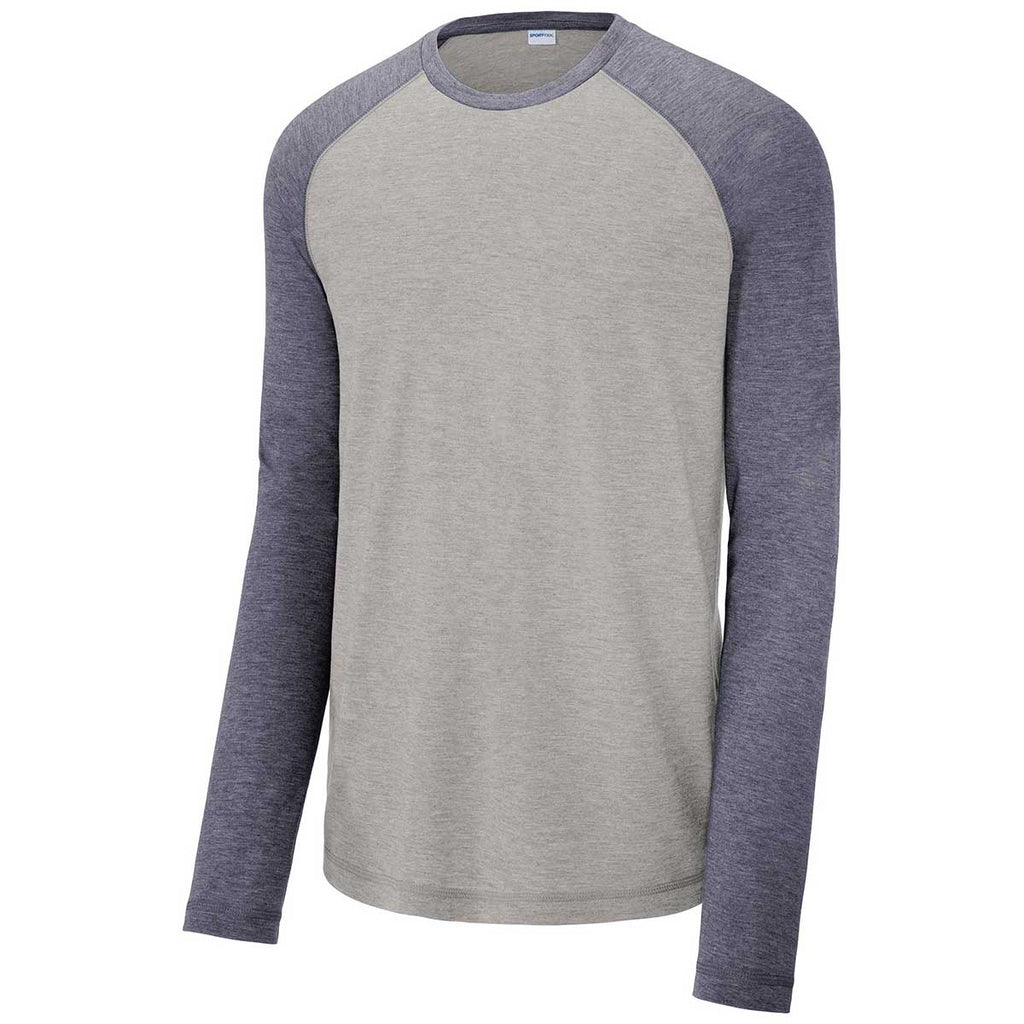 Sport-Tek Men's True Navy Heather/Light Grey Heather PosiCharge Long Sleeve Tri-Blend Wicking Raglan Tee