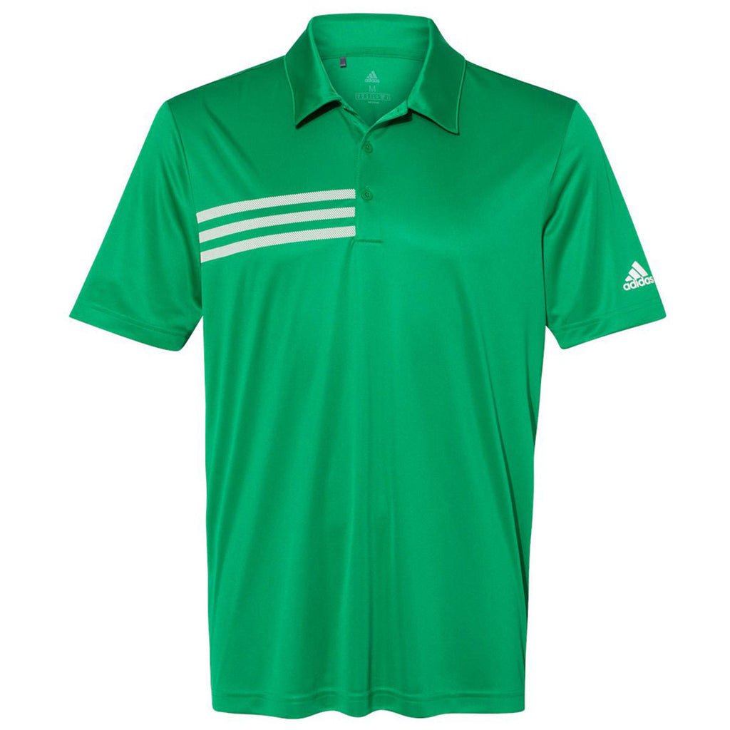 Enjoy a unique custom look with an embroidery Adidas Men's Team Green/White 3 Stripe Chest Polo. Perfect as corporate apparel when paired with a jacket or vest, this polo is made of 100% recycled polyester jersey. This means you can look great and help the environment in the traditionally styled polo with hydrophilic finish and a UPF rating of 50+. The simple design is enhanced with three stripes on the right side and a open hem with three button placket. Add a custom logo to use these polos as employee apparel that makes a statement or as employee gifts that will be an instant hit.