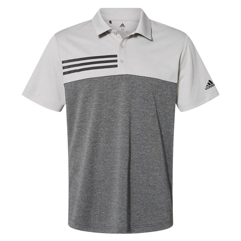 Keep it interesting with a custom Keep it interesting with a custom adidas Men's Grey Two Heather/Black Heather Heathered Colorblock 3-Stripes Sport Shirt. This unique colorblocked short sleeve shirt offers one color on the torso and another on the upper chest with triple Adidas stripes on the right side. Made of 100% recycled polyester, this shirt is well made and good for the environment. Add a custom logo to offer as corporate apparel that can easily transition to an after-work date. The UPF 50+ will keep you protected on that extra round of golf and keep you relaxed while enjoying a drink after.