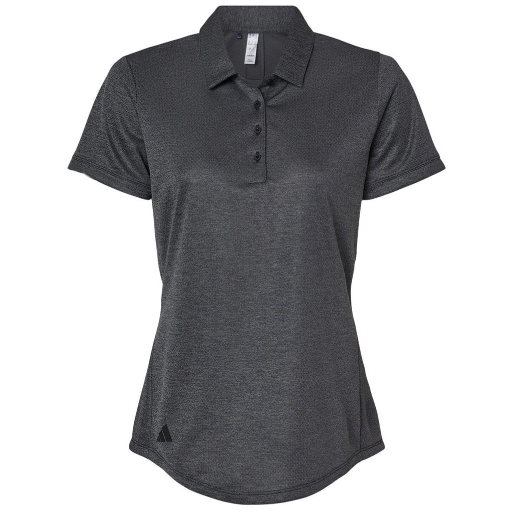 Choose a corporate logo for the Adidas Women's Black Melange Space Dyed Polo to create a durable, high-end uniform top perfect for a sales team member, caterer, server, and many others. The versatile polo has a shaped hem, back pleat, and regular fit for comfortable and crisp all-day wear. Give as a gift or sale at your specialty shop.This product cannot ship outside of the United States