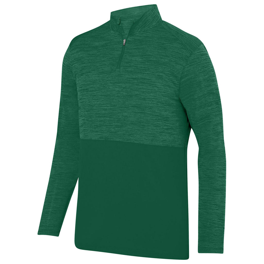 The custom Augusta Sportswear Men's Dark Green Shadow Tonal Heather Quarter-Zip Pullover offers a creative take on the highly-applauded pullover style top. Offering dual-design features, the top of this pullover is comprised of a 100% polyester heathered wicking knit material, including the collar and sleeves, while the bottom portion of the shirt is a solid 100% polyester wicking knit fabric. Other features you'll find with the men's quarter-zip pullover include a pad print label, self-fabric collar, and set-in sleeves. The pullover is available in nine trendy colors and can have your embroidery company logo added to it. This top makes a great employee apparel gift.Highlights