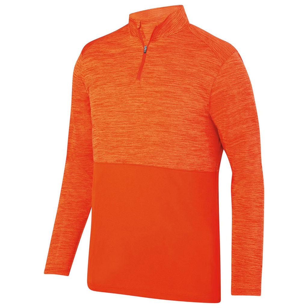 The custom Augusta Sportswear Men's Orange Shadow Tonal Heather Quarter-Zip Pullover offers a creative take on the highly-applauded pullover style top. Offering dual-design features, the top of this pullover is comprised of a 100% polyester heathered wicking knit material, including the collar and sleeves, while the bottom portion of the shirt is a solid 100% polyester wicking knit fabric. Other features you'll find with the men's quarter-zip pullover include a pad print label, self-fabric collar, and set-in sleeves. The pullover is available in nine trendy colors and can have your embroidery company logo added to it. This top makes a great employee apparel gift.Highlights