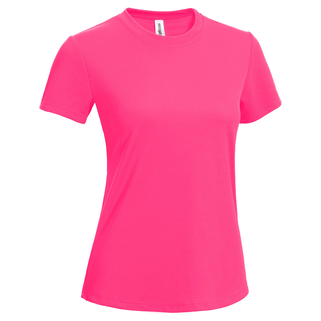 Expert Women's Hot Pink Short Sleeve Tee features short sleeves, crew neck and crafted from 100% microfiber polyester, available in a range of hues. Perfect for everyday wear or the most intense workouts, this tee comes in a relaxed fit in feminine contoured design. Soft, breathable fabric expertly wicks sweat to keep you as dry as possible. Treated with BodyFreshe to eliminate odors and inhibit odor-causing bacteria. Promote a healthy and active lifestyle with these workout-ready shirts, ready to sport custom logo imprint of your company.