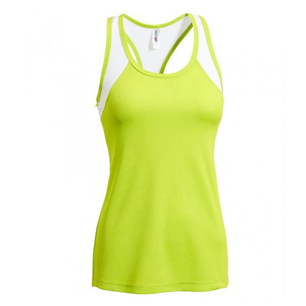 Head to the gym in this racerback-inspired Expert Women's Lime/White Distance Singlet that screams 'I don't glisten, I sweat' attitude. Self-binding neck and armholes ensure no-fuss movement of your guns. The racerback cut will make you feel workoutaholic the more iron you pump. Contrast panels add to aesthetics of this sleeveless workout top while a fold over pocket holds your essentials. Treated with antibacterial and sweat-wicking properties. Customize this women's singlet with your logo to bring your company to the public eye. Perfect for dance studios, gyms and other businesses related to active lifestyle.The minimum order for this product is 12 pieces.