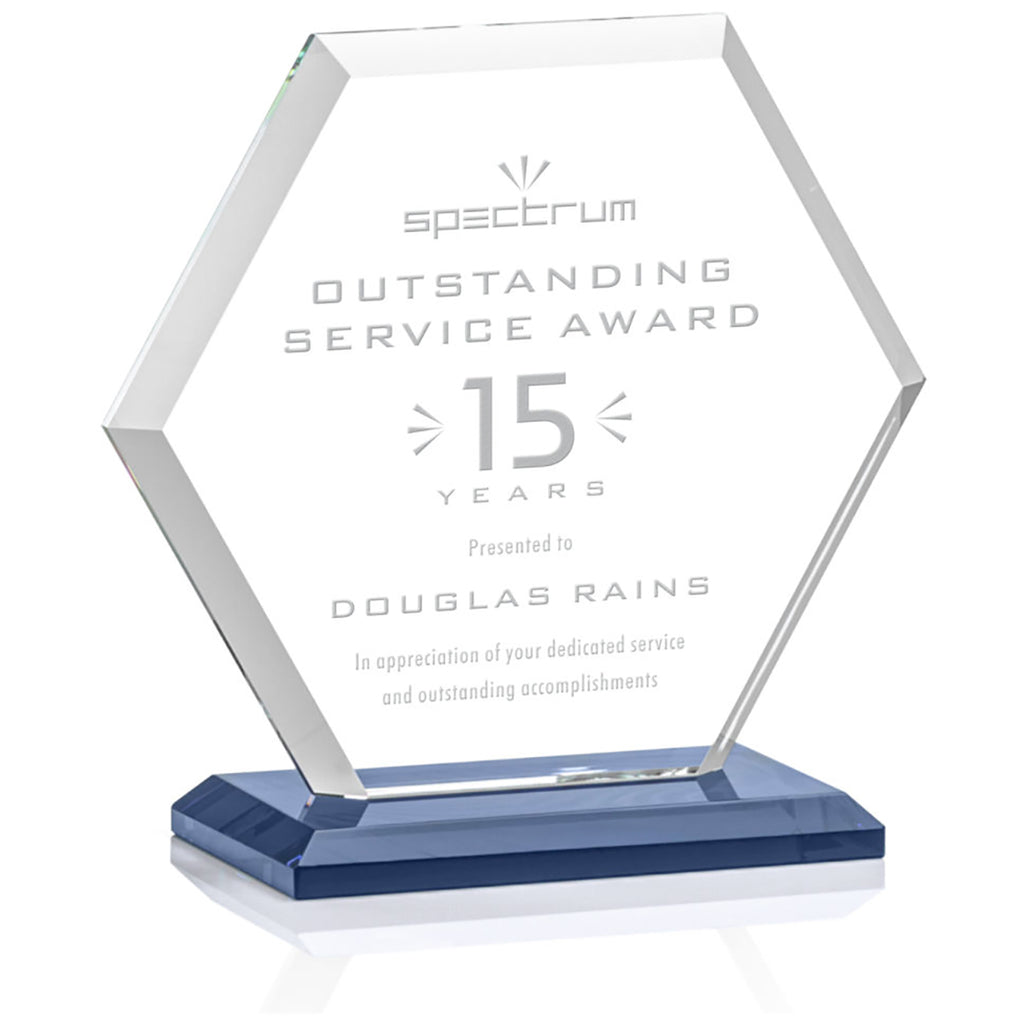 St. Regis Blue Barnett Award 6" x 6.25" x 3" - Laser Engraved with a custom message comes in multiple sizes to fit your special awards ceremony needs. The beveled Starfire Crystal hexagon is mounted on your choice of bases. Perfect to recognize outstanding service, anniversaries, or anything you choose. Order before your next event.