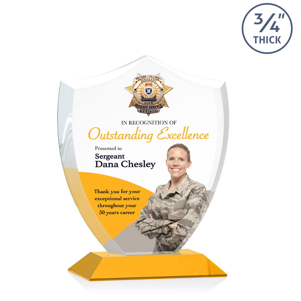 Choose your custom design for the St. Regis Amber Scudo Shield Award 6.25" x 7.75" x 3" with Standard Base - Printed to show appreciation to those who show excellence daily. The shield design makes these ideal for first responders, law enforcement, and others who focus on protection, authority, and stability in the community. Order early so you do not miss out.