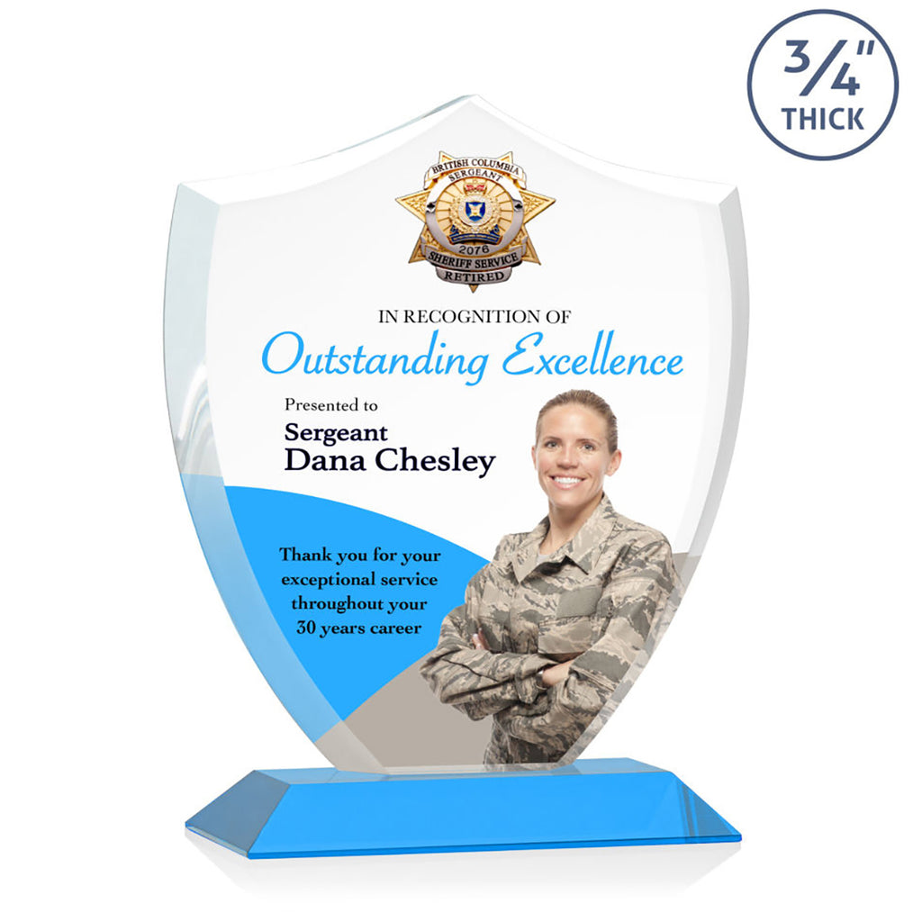 Choose your custom design for the St. Regis Sky Blue Scudo Shield Award 7.25" x 8.75" x 3" with Standard Base - Printed to show appreciation to those who show excellence daily. The shield design makes these ideal for first responders, law enforcement, and others who focus on protection, authority, and stability in the community. Order early so you do not miss out.