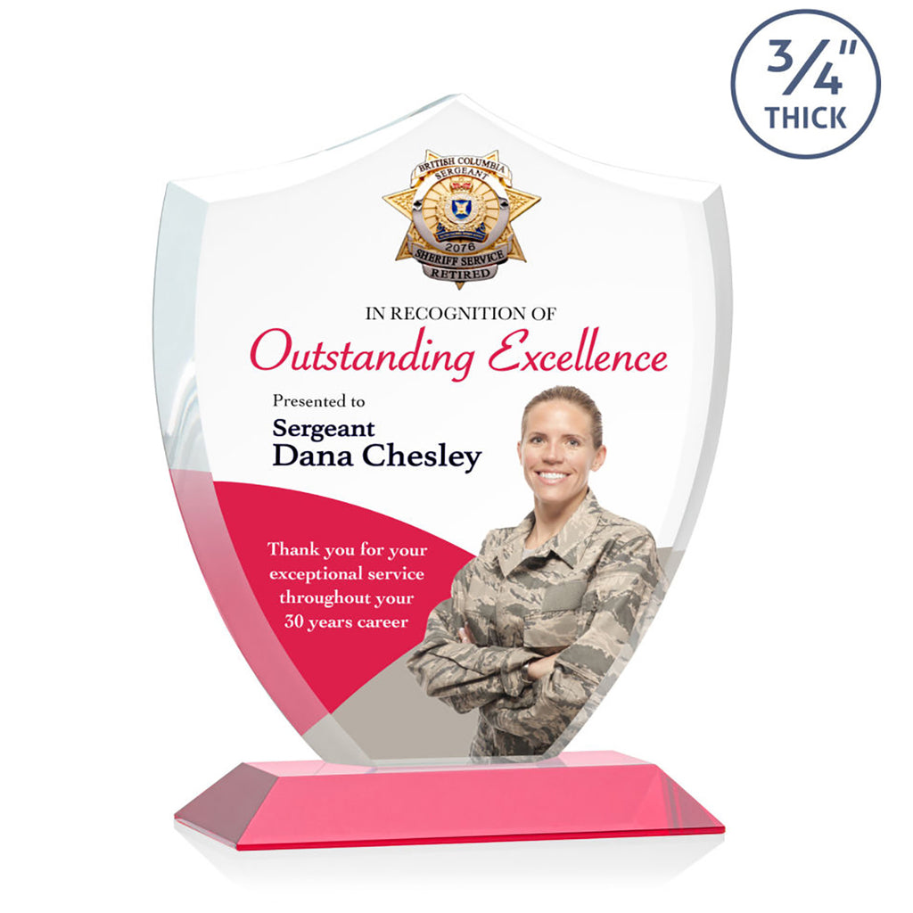Choose your custom design for the St. Regis Red Scudo Shield Award 7.25" x 8.75" x 3" with Standard Base - Printed to show appreciation to those who show excellence daily. The shield design makes these ideal for first responders, law enforcement, and others who focus on protection, authority, and stability in the community. Order early so you do not miss out.The minimum order for this product is 1 piece.