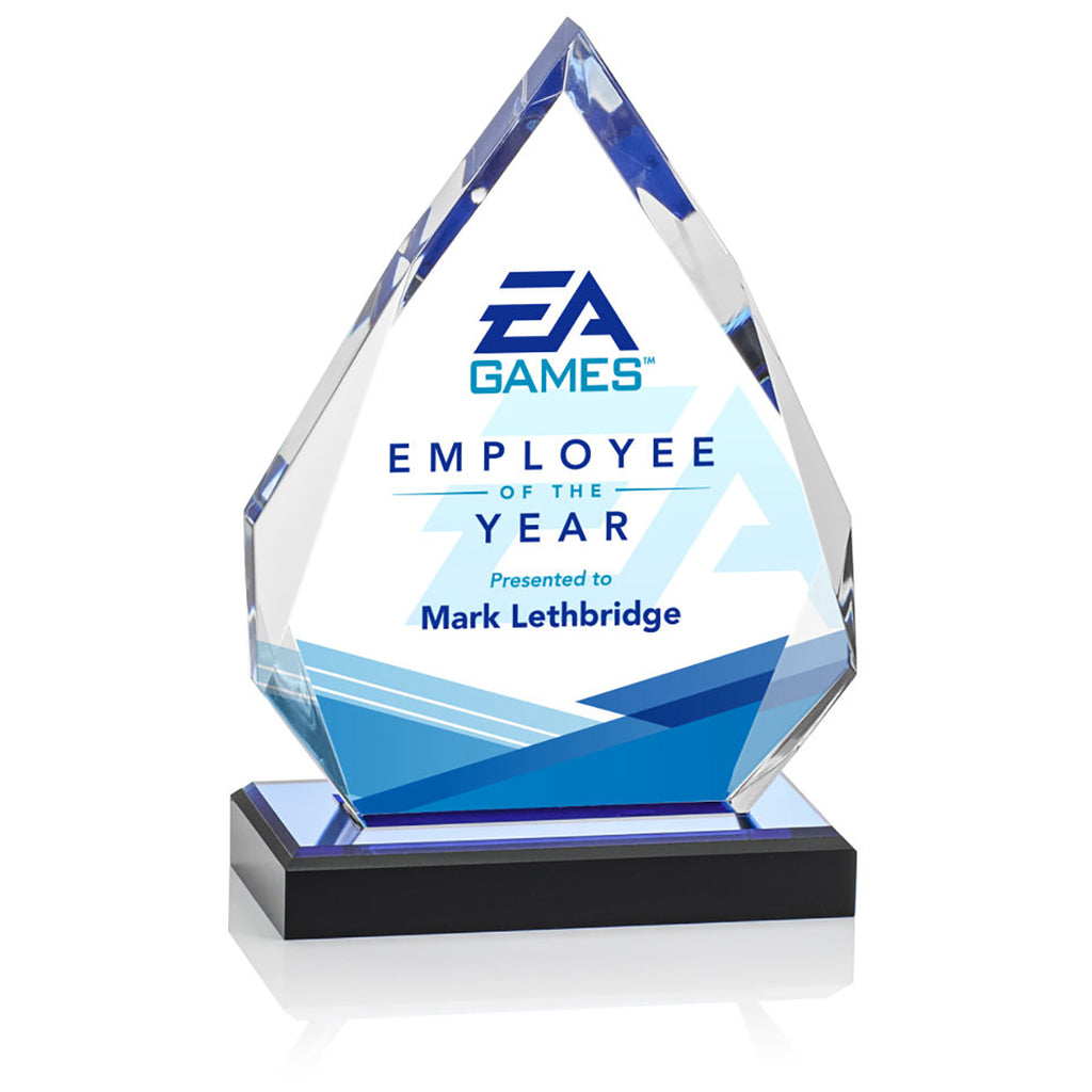 The St. Regis Blue Beckenham Award 5.25" x 7.75" with Standard Base - Printed with a custom or corporate logo is a wonderful way to recognize a special achievement or goal. The gorgeous ebony base with a golden reflective top radiates gold through the interchanging facets toward the peak. Perfect for employment anniversaries, outstanding service, and top marks.