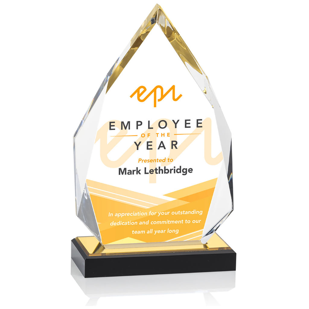 The St. Regis Gold Beckenham Award 5.25" x 8.75" with Standard Base - Printed with a custom or corporate logo is a wonderful way to recognize a special achievement or goal. The gorgeous ebony base with a golden reflective top radiates gold through the interchanging facets toward the peak. Perfect for employment anniversaries, outstanding service, and top marks.