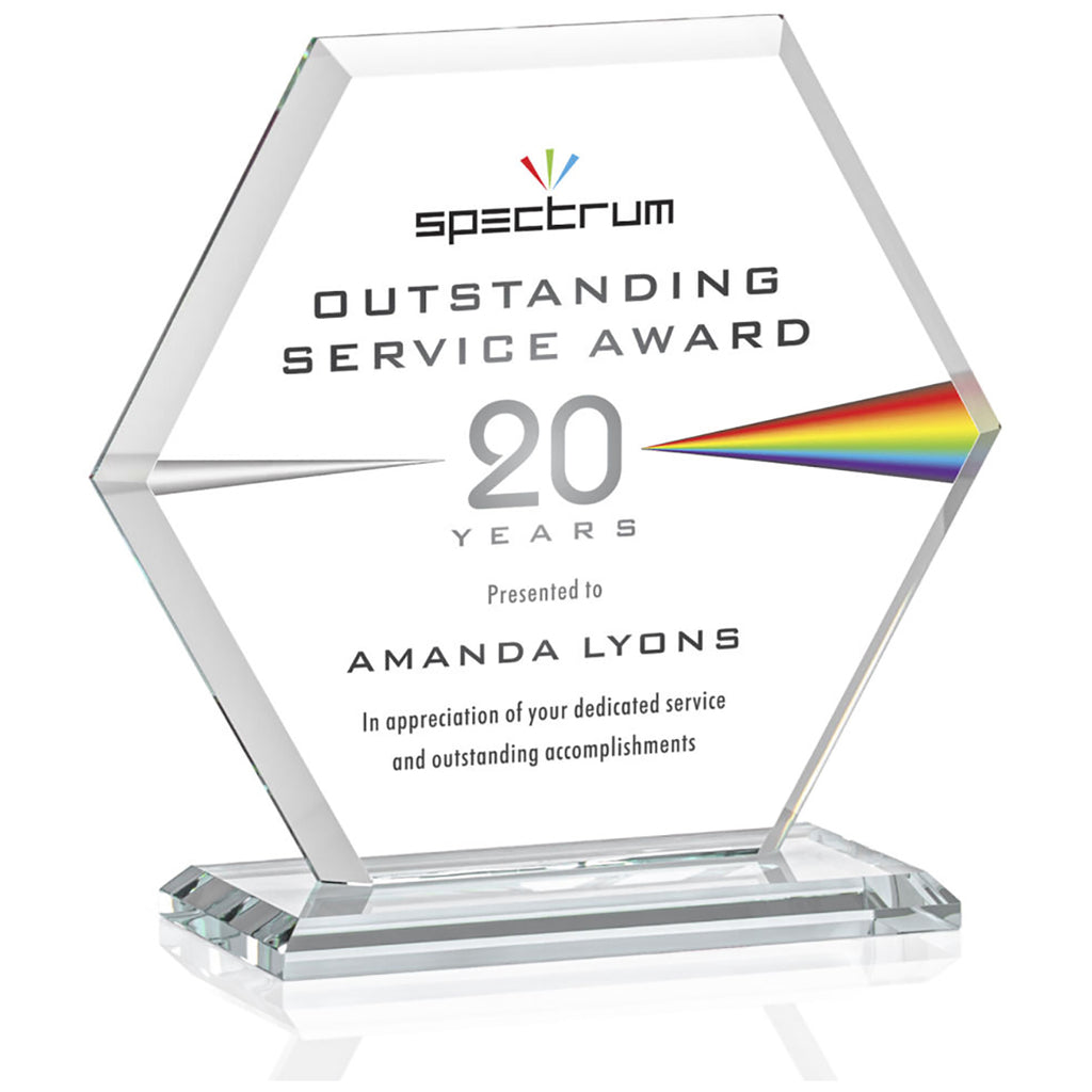 St. Regis Clear Barnett Award 7" x 7.25" x 3" - Printed with a custom message comes in multiple sizes to fit your special awards ceremony needs. The beveled Starfire Crystal hexagon is mounted on your choice of bases. Perfect to recognize outstanding service, anniversaries, or anything you choose. Order before your next event.
