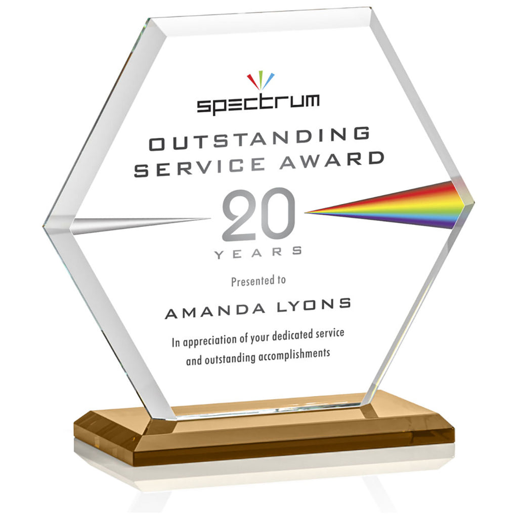 St. Regis Amber Barnett Award 7" x 7.25" x 3" - Printed with a custom message comes in multiple sizes to fit your special awards ceremony needs. The beveled Starfire Crystal hexagon is mounted on your choice of bases. Perfect to recognize outstanding service, anniversaries, or anything you choose. Order before your next event.