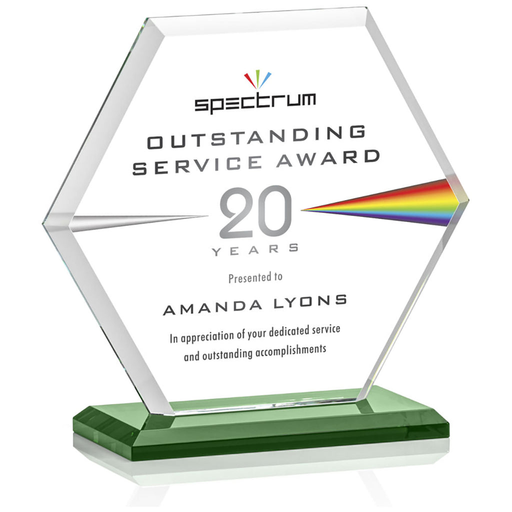 St. Regis Green Barnett Award 7" x 7.25" x 3" - Printed with a custom message comes in multiple sizes to fit your special awards ceremony needs. The beveled Starfire Crystal hexagon is mounted on your choice of bases. Perfect to recognize outstanding service, anniversaries, or anything you choose. Order before your next event.The minimum order for this product is 1 piece.