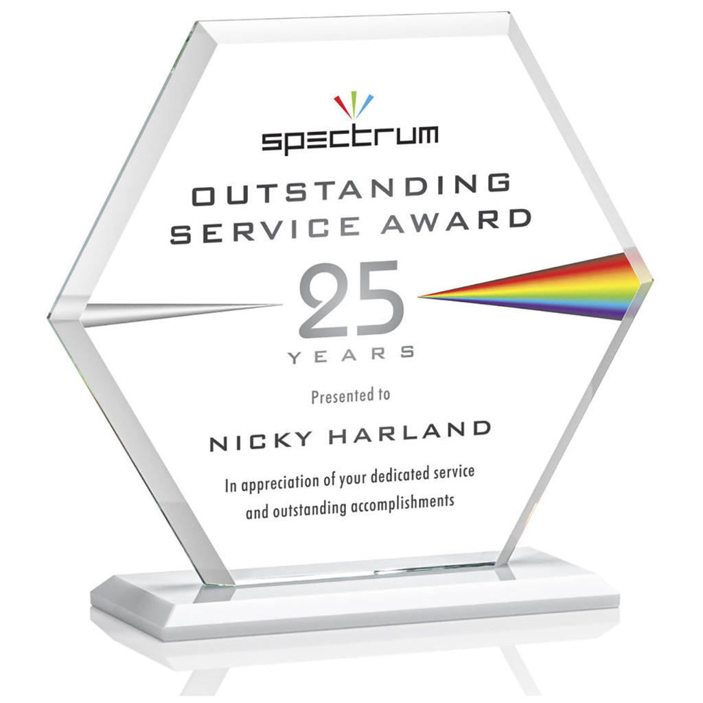 St. Regis Clear Barnett Award 8" x 8.25" x 3" - Printed with a custom message comes in multiple sizes to fit your special awards ceremony needs. The beveled Starfire Crystal hexagon is mounted on your choice of bases. Perfect to recognize outstanding service, anniversaries, or anything you choose. Order before your next event.The minimum order for this product is 1 piece.