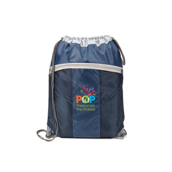 - 210D polyester, two tone mesh and nylon drawstring bag with front zippered pocket
