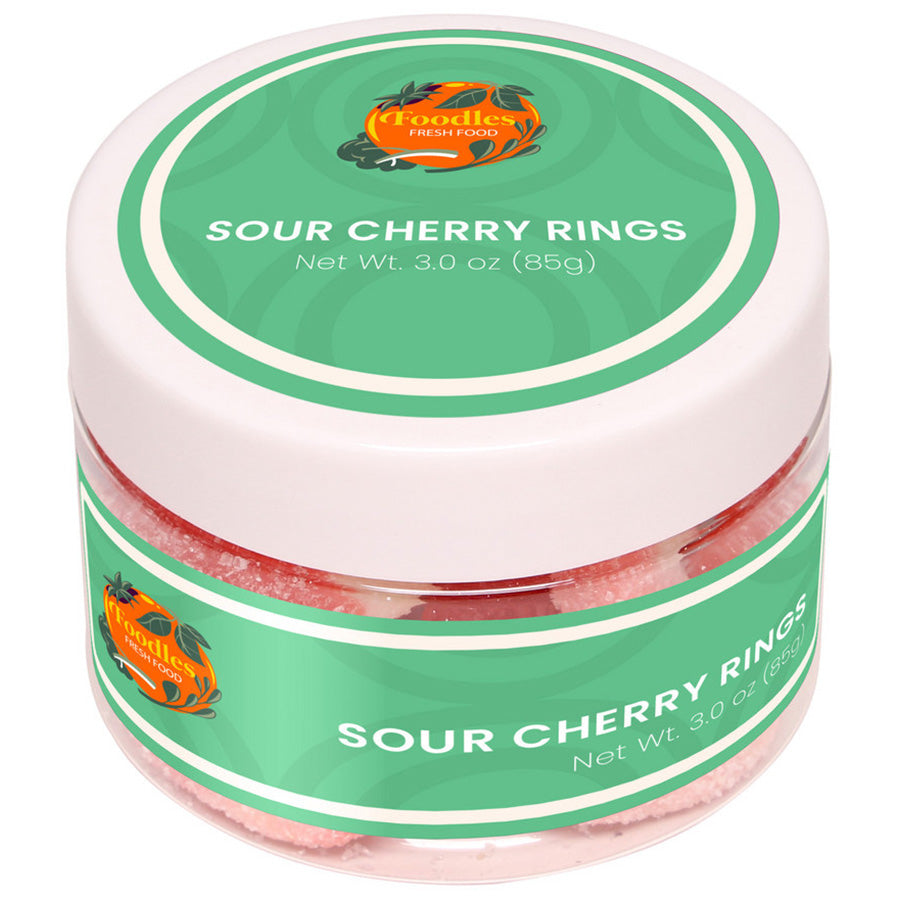 • Red-and-white cherry gummy rings with a sour coating