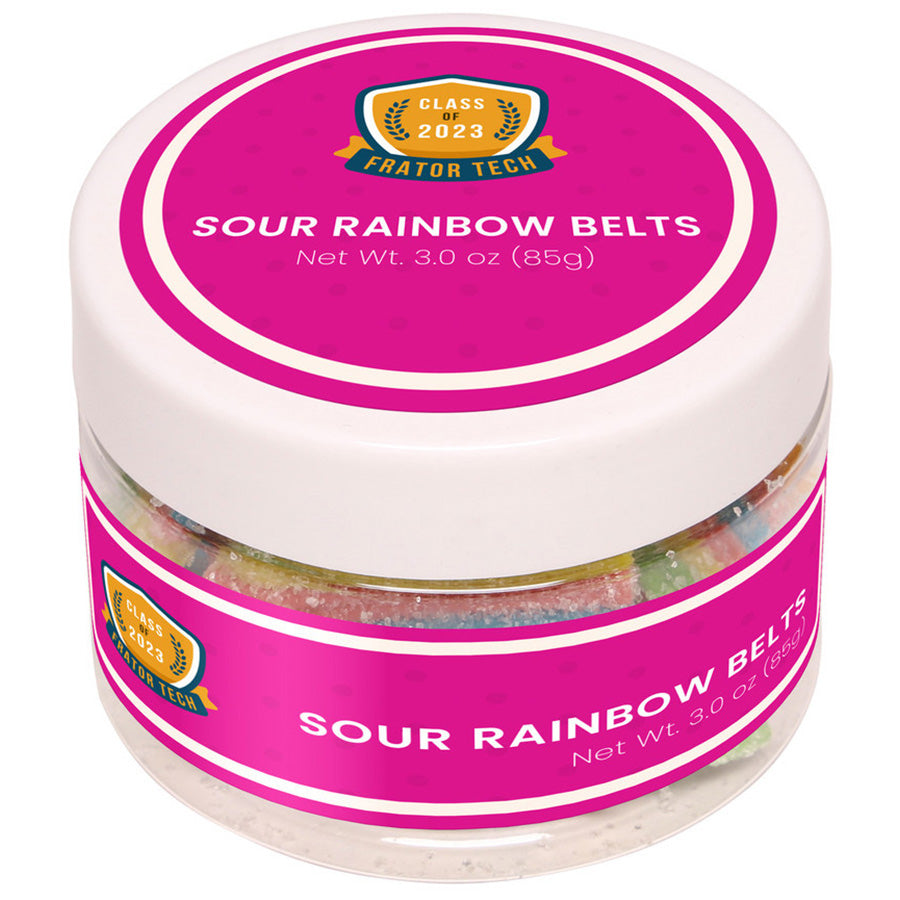 Design a custom logo for the SugarSpot Clear Sour Rainbow Belts: Small Jar to delight the taste buds. These rainbow sour snacks are fun and colorful, making them a wonderful addition to any party. Celebrate pride, a birthday, or a big event with a shock of flavor in a carriable jar. Place an order today to make sure your next event is on point.