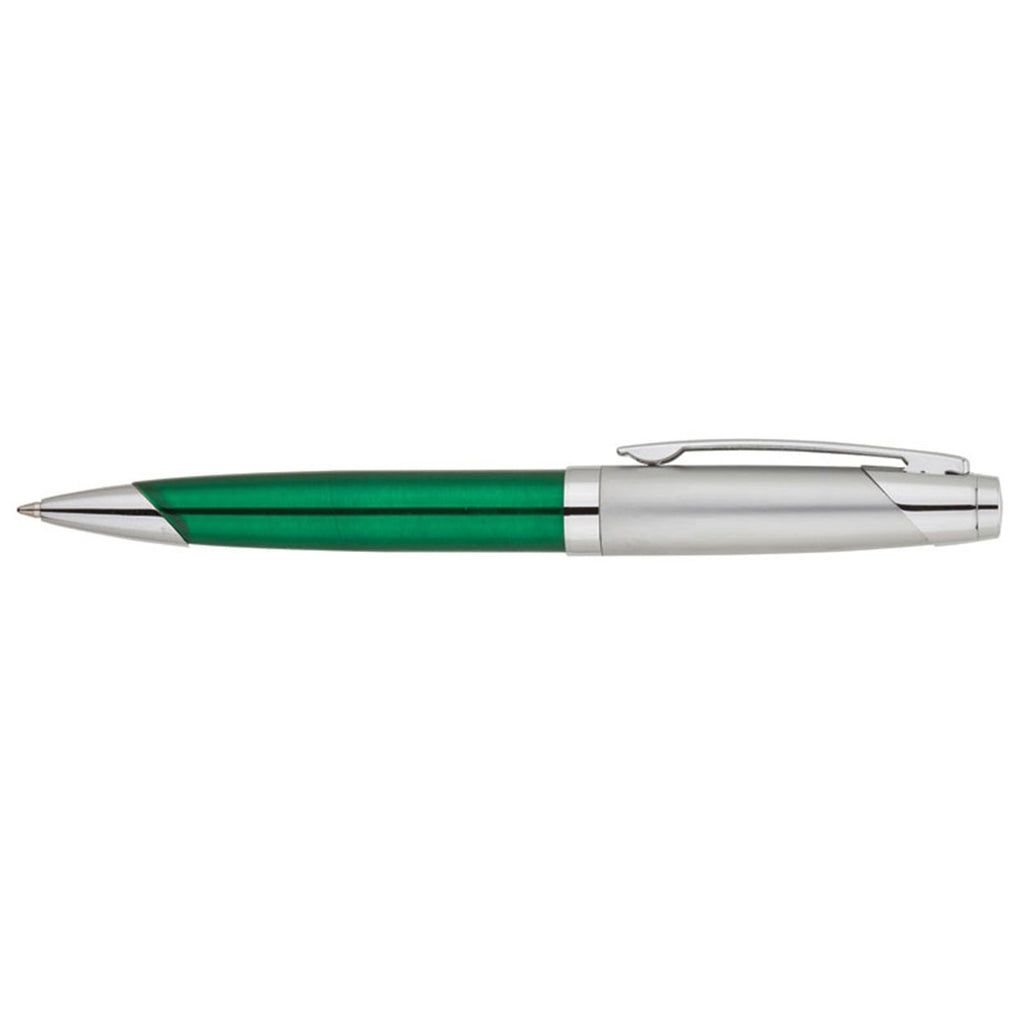 Logomark Green Espada Ballpoint Pen boasts a rich, glossy-hued barrel with a twist-action mechanism and a silver cap that proudly hosts the custom logo engraving of your brand or company. Chrome accents add a touch of modern elegance and lend panache to any ensemble when ensconced in a breast-pocket.
