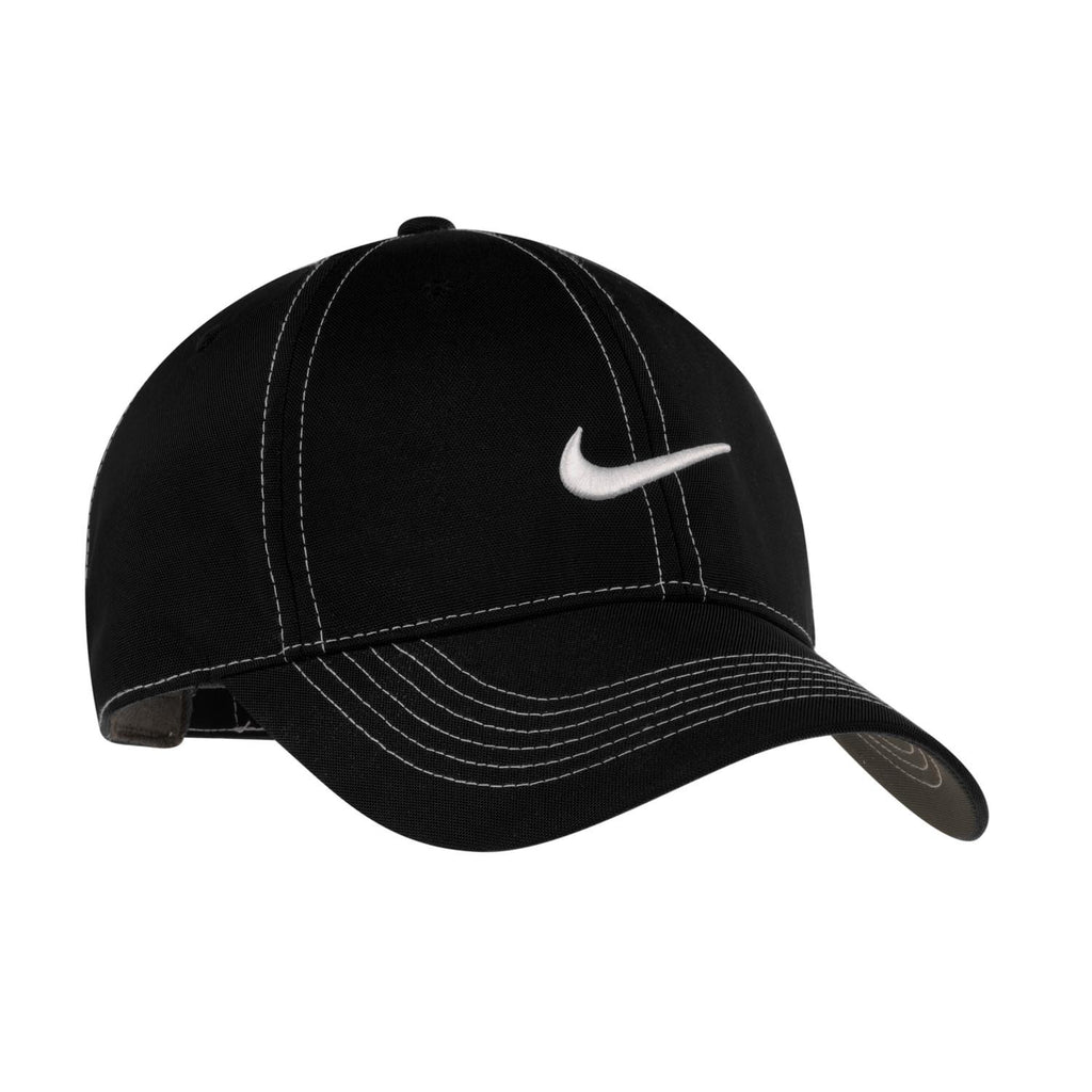 Nike Golf caps are a must for those who love a sporty look, or simply want some much-needed time off from the sun without heading indoors. The Nike Black Swoosh Front Cap is made up of 100% lightweight polyester and has an unstructured, low-profile design. This custom Nike cap also features contrast stitching, a classic Swoosh trademark logo and a hook and loop closure. Available in a wide array of colors.