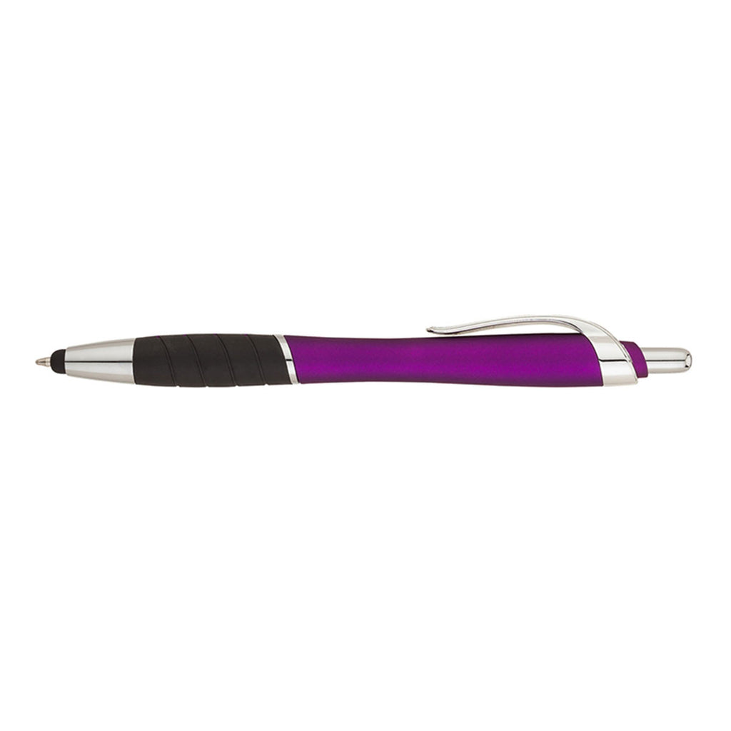 Distinguished by a metallic colored barrel and textured rubber grip to provide style and comfort for everyday use. It also has a conductive stylus you can use on your touch-screen devices. Impress your employees and clients by customized Valumark Wave Deluxe Purple Pen + Stylus imprinted with your company logo.