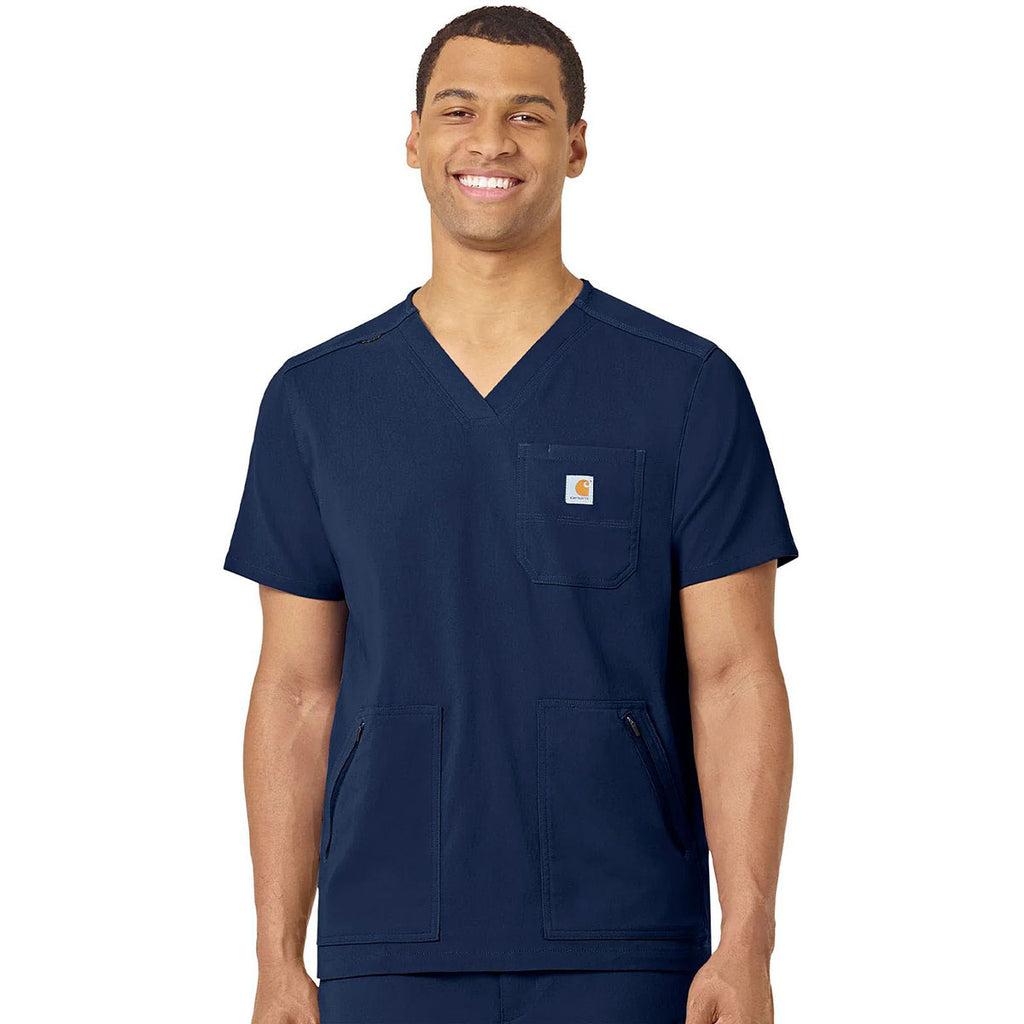 Carhartt Men's Navy Modern Fit 5-Pocket V-Neck Top with a custom logo is a must-have for those who work in the medical industry, as vets, as techs, and much more. The durable top has stretch technology, water-repellency, and a chest pocket. Side vents keep you cool and allow you freedom of range of movement that is needed each day.