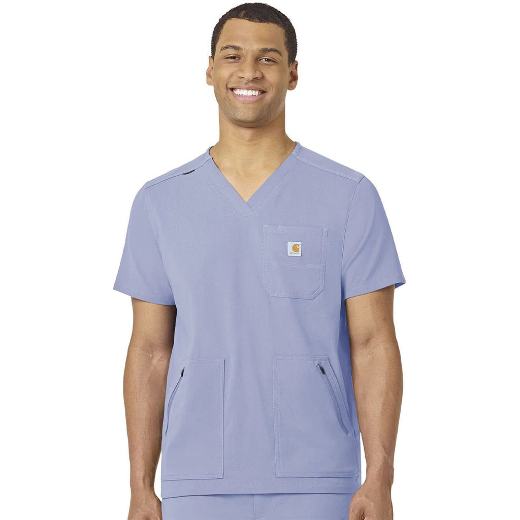 Carhartt Men's Ceil Blue Modern Fit 5-Pocket V-Neck Top with a custom logo is a must-have for those who work in the medical industry, as vets, as techs, and much more. The durable top has stretch technology, water-repellency, and a chest pocket. Side vents keep you cool and allow you freedom of range of movement that is needed each day.Highlights