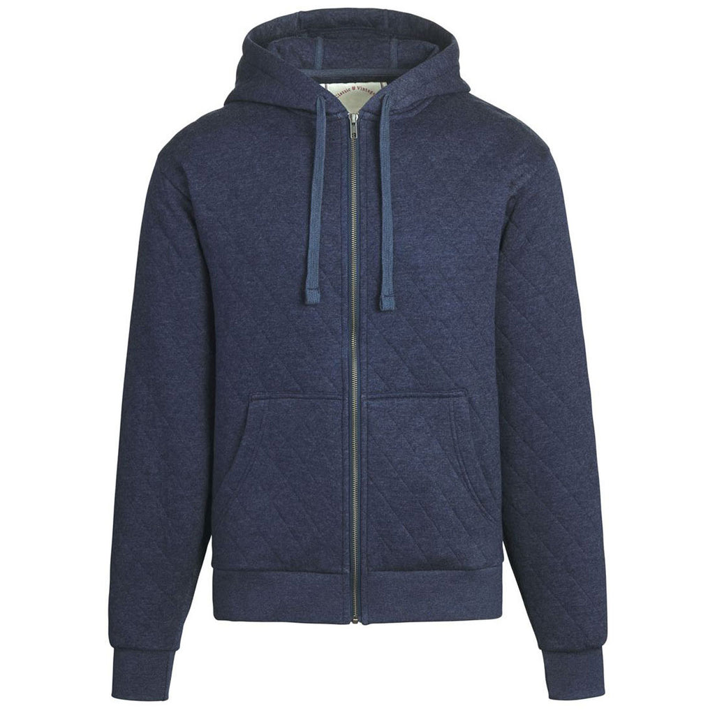 Enjoy an embroidered custom look with the Landway Men's Heather Navy Kingsley Quilted Fleece Hoodie. The Kingsley combines a relaxed fit, insulated design, and vintage details for a fun and fashionable look that is great for a morning commute or an evening hanging out with friends. Add a company logo to use as part of employee apparel for those who work outdoors or as employee gifts for any occasion. Try a custom logo on this full zip hoodie for a look that will fly off shelves. Place an order to make sure this hoodie is part of your logoed apparel line as soon as possible.Highlights
