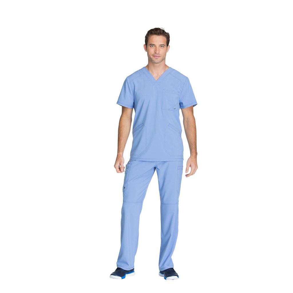 This Cherokee Men's Ceil Infinity Athletic V-Neck Top by Cherokee use durable polyester-spandex blend stretch fabric that gives you freedom of movement while bending, stretching, and lifting. It is designed with a chest pocket embellished with grommet and two side pockets enhanced with topstitching. Incorporating front and back yokes, this one is a comfortable and classic option enhanced with stretch rib knit back panels for added comfort. Make this scrub uniform distinctively yours by adding an embroidered logo or font with our quick and affordable customization service. Ideal for hospitals, healthcare centers, dental offices, medical response teams.Highlights