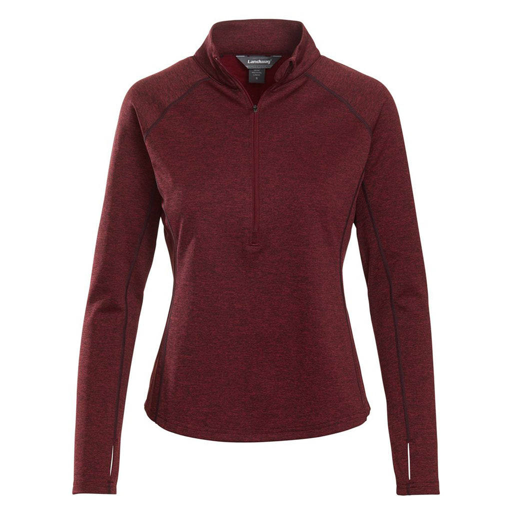 The corporate logo Landway Women's Heather Deep Red Alpha Heathered 1/4-Zip Pullover offers comfortable style in this must-have embroidery logo women's shirt. Available in four classic colors, this 1/4-zip pullover features a 100% yarn-dyed polyester melange fabric, an athletic fit, four-way stretch fabric, active dry moisture wicking fabric, flatlock stitching, raglan sleeves, and a reflective strip on the back yoke. By adding a company logo to the shirt, you are provided with an excellent gift option for upcoming golf events where your company sponsors the outing and provides the corporate-sponsored gifts at the end.Corresponding Men's Style: Landway Men's Heather Deep Red Alpha Heathered 1/4-Zip Pullover