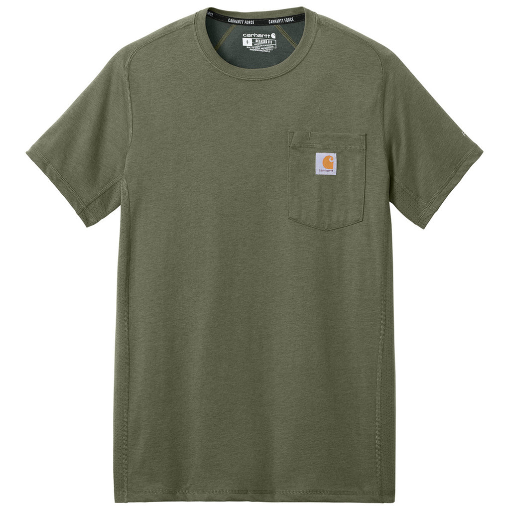 Be tough and comfortable in a custom Carhartt Men's Basil Heather Force Short Sleeve Pocket T-Shirt. This simple tee is made for those who work and play hard. The chest pocket is great for small tools and other needed items as you work outdoors, camp, hunt, fish, or whatever you choose. Place an order right away; these will go fast.This product can only ship within the United States and Canada.