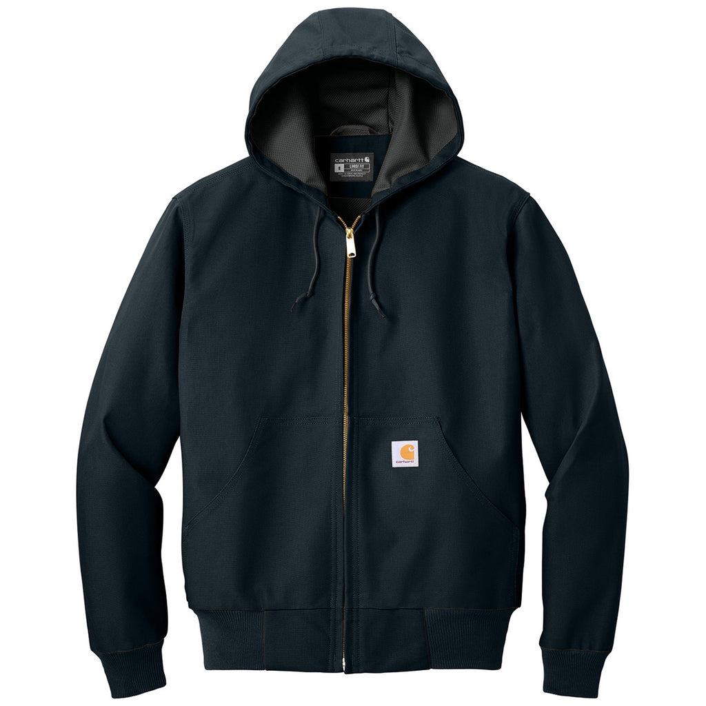 Carhartt Men's Dark Navy Thermal-Lined Duck Active Jacket with a custom logo is a wonderful way to stay toasty while enjoying the Great Outdoors. This jacket with Wind Fighter technology has a polyester lining with an attached three-piece hood and plenty of pockets for the necessities. Great for hunters, farmers, and those who work outdoors.This product can only ship within the United States and Canada.