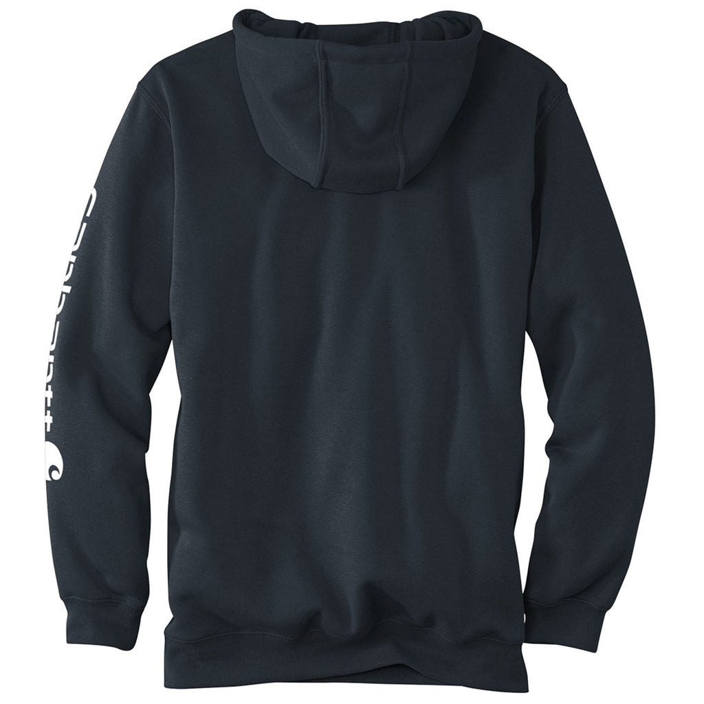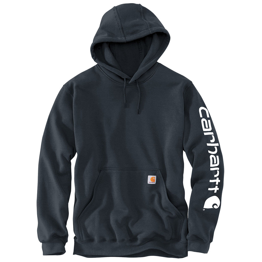 Carhartt Men's New Navy Midweight Hooded Logo Sweatshirt with a custom logo is the ultimate in athleisurewear. The layerable sweatshirt with front kangaroo pocket features the Carhartt logo along the left sleeve and is stretchable, triple-stitched, and loose-fitting. Great for working outdoors, working out, or lounging at home. Order today.This product can only ship within the United States and Canada.