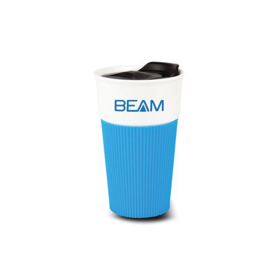 The Bistro is no-fuss, no-frills ceramic mug by K & R. Silicone sleeve provides a comfortable, heat-free and firm grip. Equipped with push-on lid for easy use while on the go. Custom ceramic mugs communicate your custom logo or message in style and make functional recognition items.