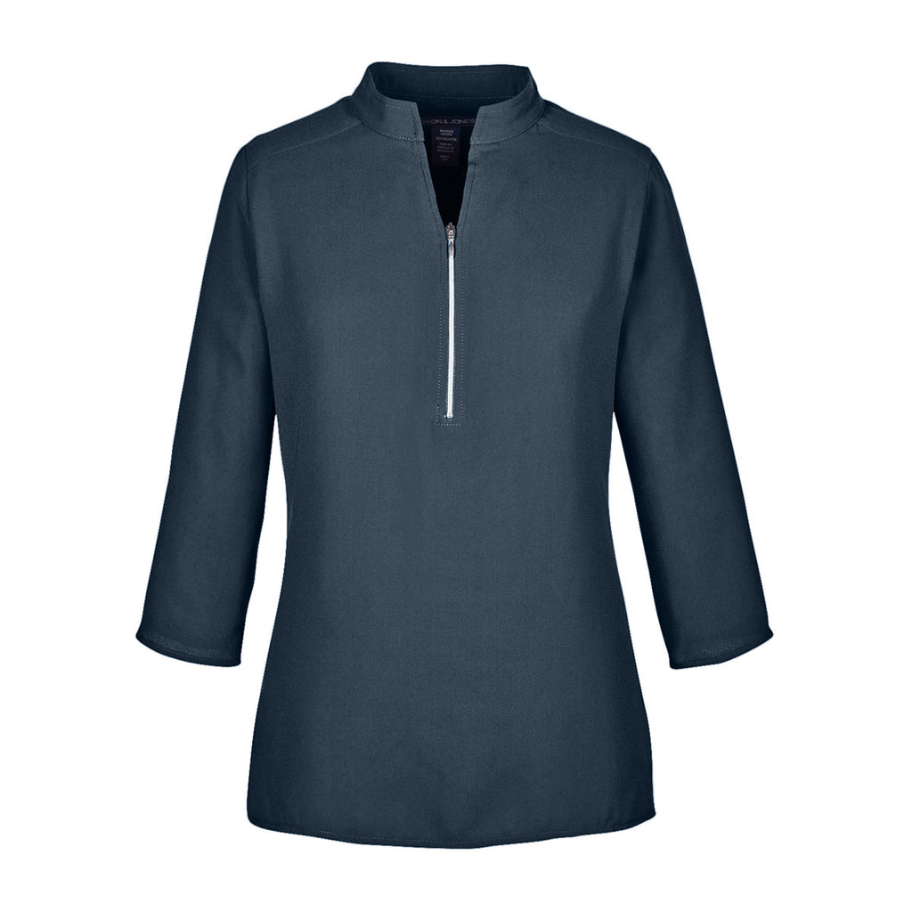 Refined and oh-so sleek, the Devon & Jones Women's Navy Perfect Fit Three-Quarter Sleeve Crepe Tunic flaunts a delightfully feminine silhouette and lends fluidity to your look. Longer length is suitable for everyday activity and full spectrum of movement. It flaunts an always-flattering and silhouette ready to mix with your existing wardrobe for instant flair. Other features include double layer back yoke with center back pleat, front metal zipper and side slits. Create an immediate sense of recognition, deepen your corporate identity and build familiarity and trust for your brand by adding your company's logo to this crepe blouse.Highlights
