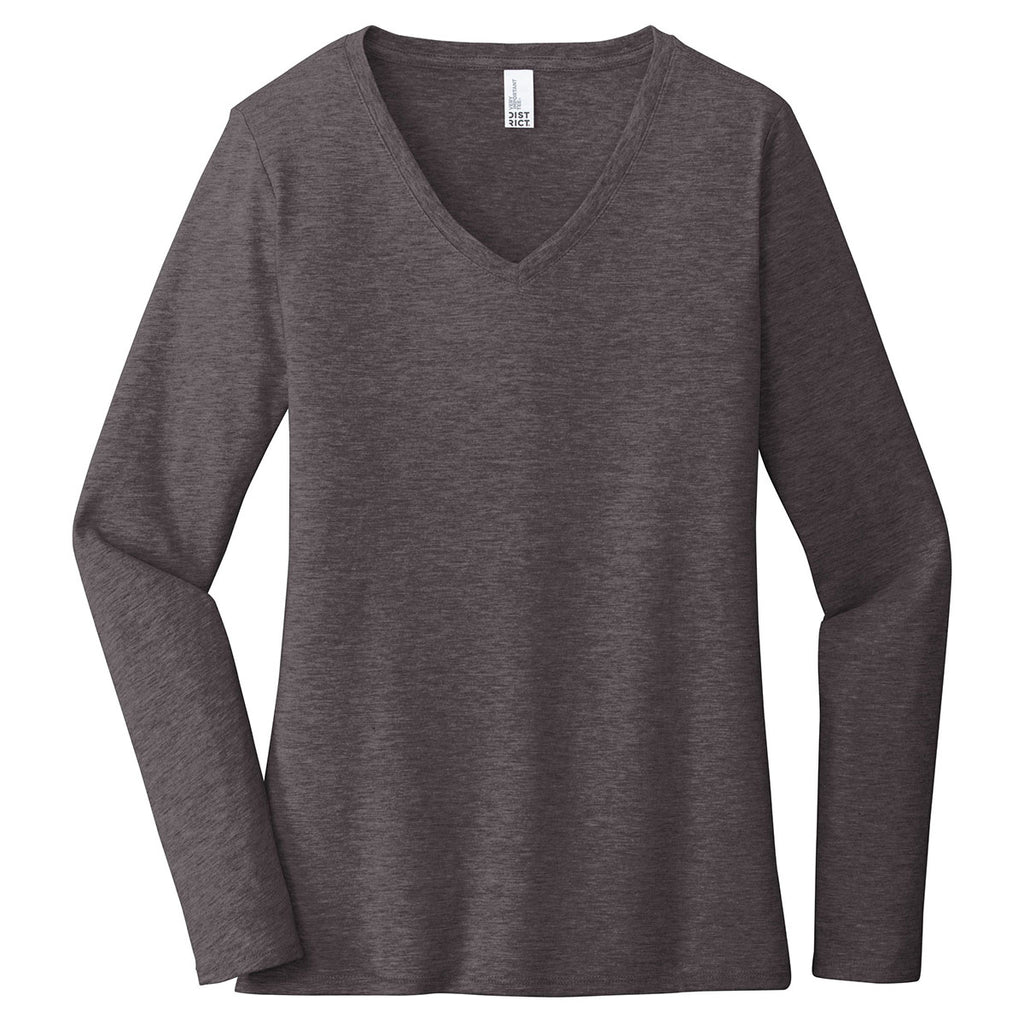 Before the next job fair, turn the corporate recruiting event into a display of fashion expertise by ordering the screen printed District Women's Heathered Charcoal Very Important Tee Long Sleeve V-Neck. The multi-use long sleeve tee works as well as standalone corporate apparel at a casual restaurant, as it does as the first layer of a cold weather fashion ensemble worn on a weekend camping trip. One-hundred percent ring spun cotton feels soft against the body. Add a custom logo to connect with potential customers at civic events. The long sleeve v-neck tee is the ultimate company giveaway.Highlights