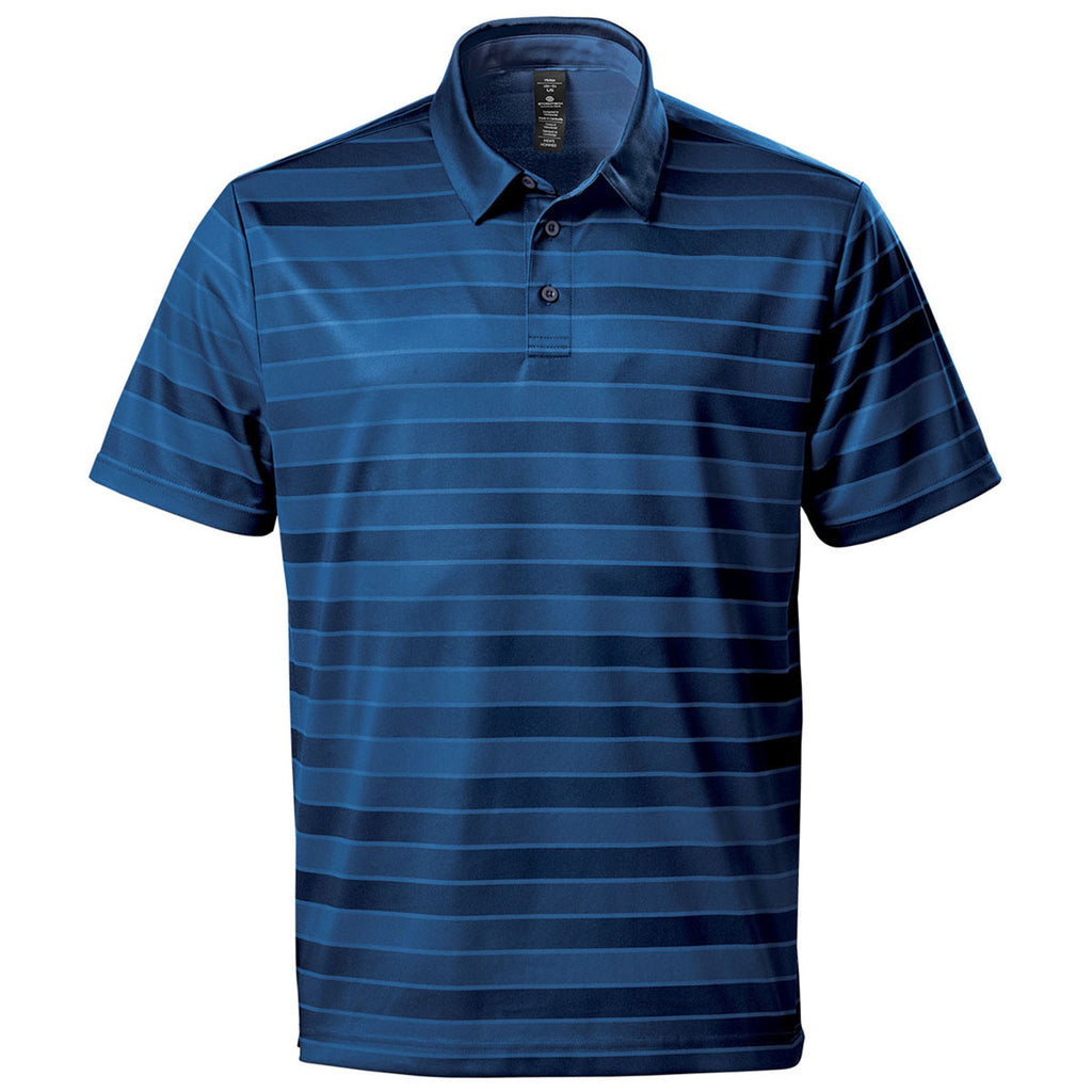 The Stormtech Men's Classic Blue Sienna Short Sleeve Polo features a horizontal gradient stripe pattern that will provide the perfect backdrop for your company's custom logo or design. Comfortable, breathable, and incredibly flattering, this polished polo features superior H2X-DRY moisture management technology and UPF sun protection.