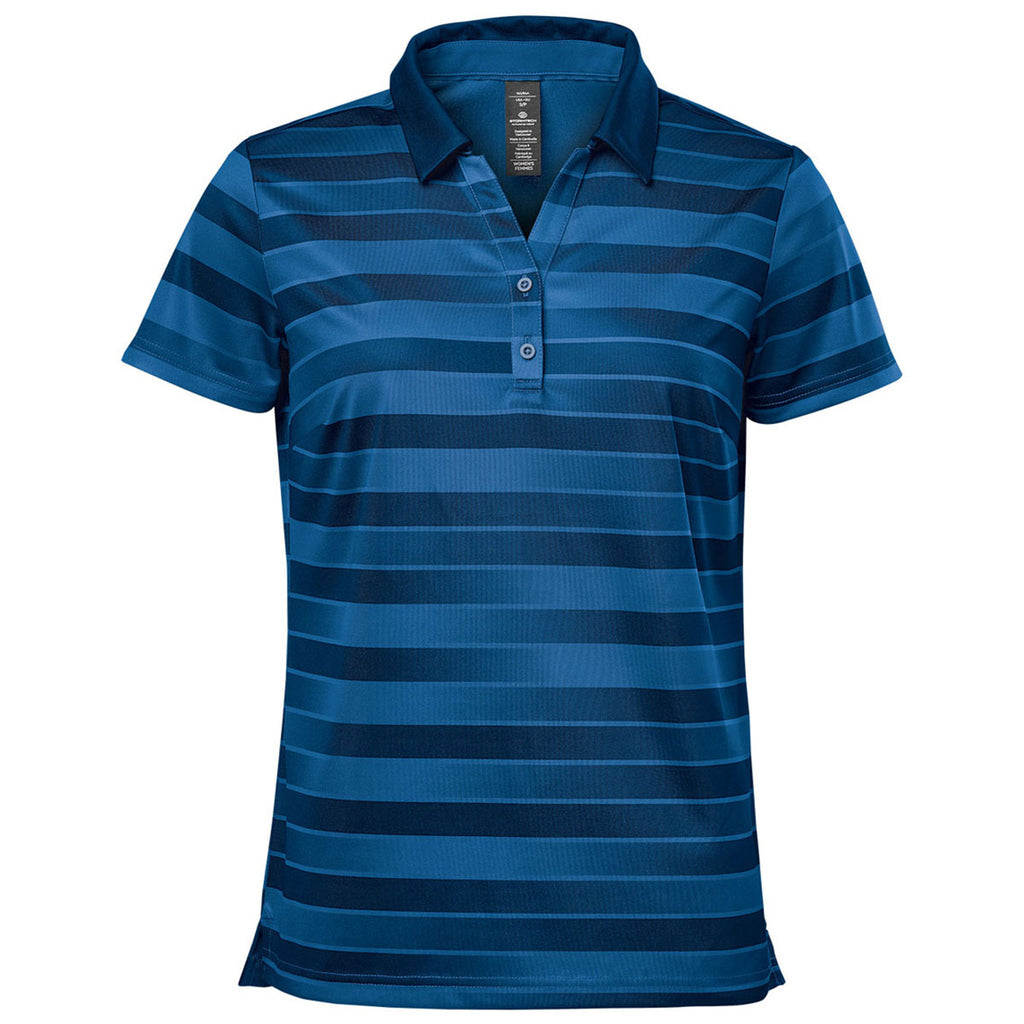Outfit your team to perfection by adding your company's custom logo or design to the Stormtech Women's Classic Blue Sienna Short Sleeve Polo. Covered in a horizontal gradient stripe pattern, this professional polo features H2X-DRY moisture management technology and UPF sun protection, making it perfect for athletes and anyone with an on-the-go lifestyle.