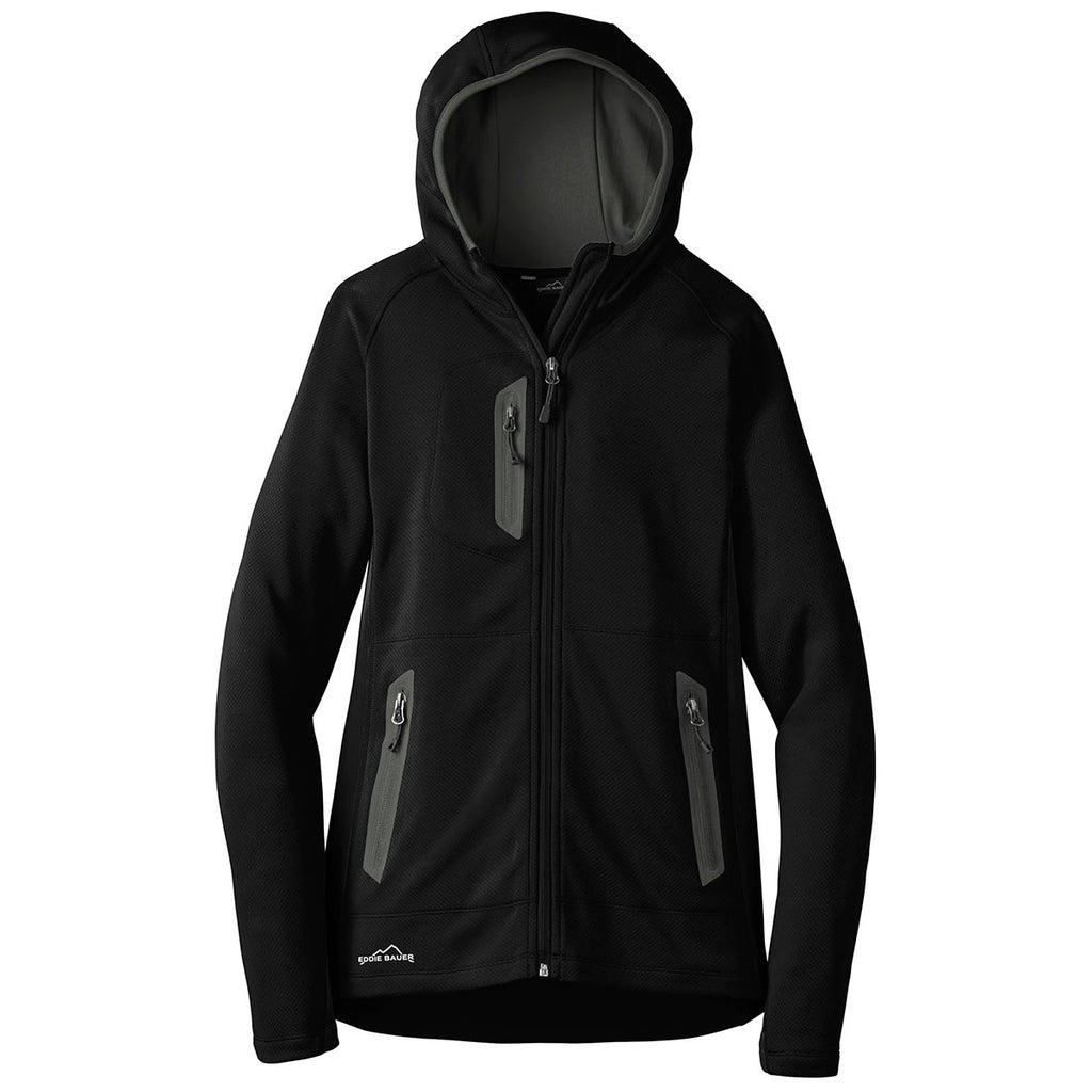 With a logo, you transform the Eddie Bauer Women's Black Sport Hooded Full-Zip Fleece Jacket into the leader among corporate issued jackets. Your company logo gets the word out about your brand at industry sales conferences. The medium weight jacket contains smooth faced fleece to deliver optimal comfort for every outdoor adventure. Rugged polyester resists the types of rips and tears caused by continued use. The welded zippered chest pocket gives you quick access to camping accessories and electronic devices. Give the thermal jacket to the members of your corporate team as a way of saying thank you for their hard work.