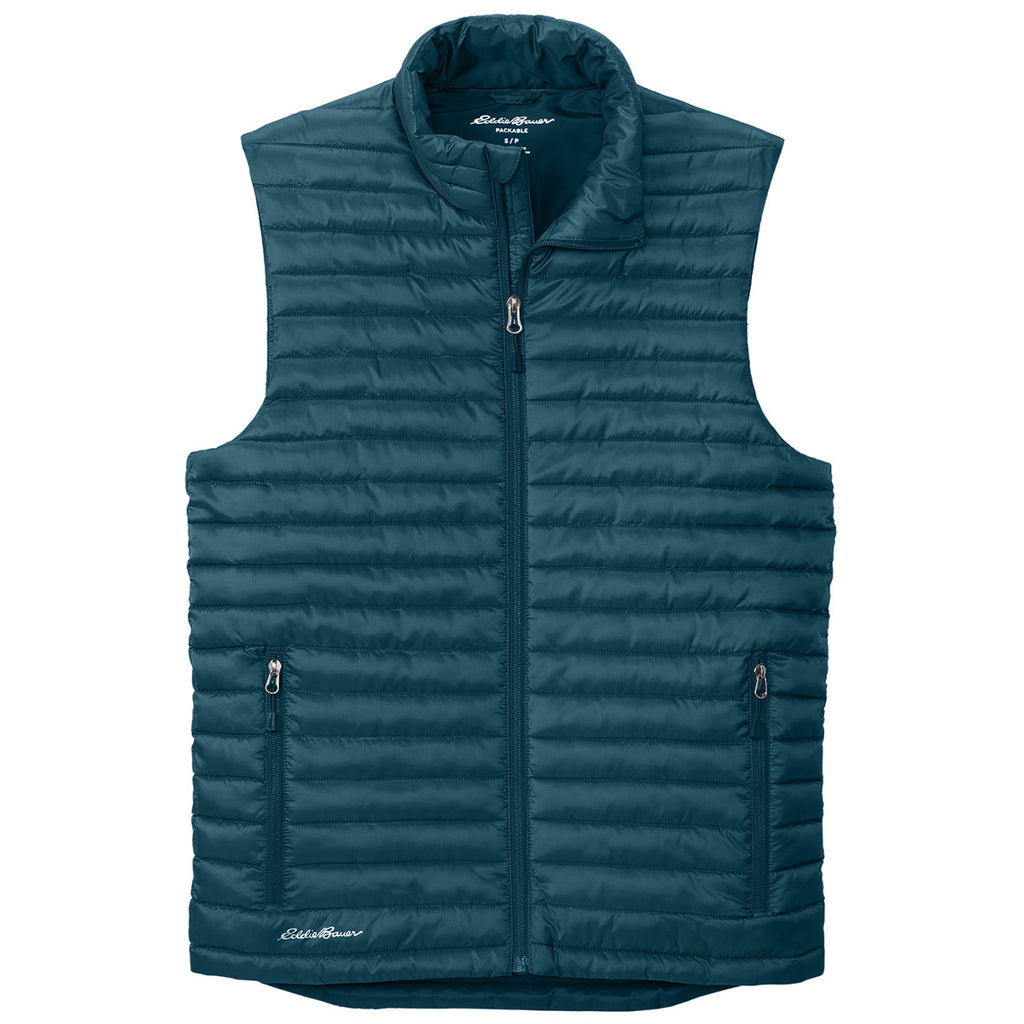 Eddie Bauer Men's Adriatic Blue Packable Quilted Vest with a custom design is a fun and functional way to stay toasty while enjoying the Great Outdoors. This packable vest can be worn and then easily packed away when it is no longer needed for the day. Perfect for hiking, camping, and hunting. Place an order right away.This product can only ship within the United States, Puerto Rico, Canada, and Mexico.